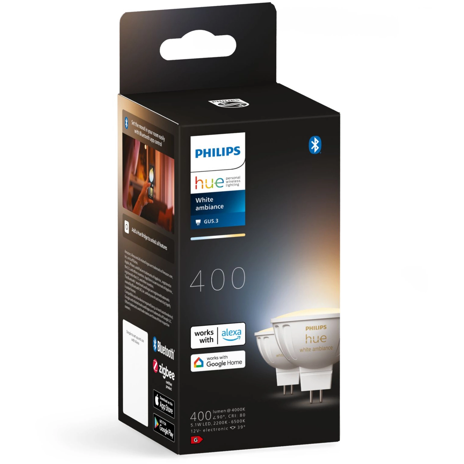 Komplet inteligentnych żarówek HUE LED renomowanej i cenionej w branży oświetleniowej firmy Philips. Zostały wyposażone w gwint GU5.3 oraz w energooszczędne źródło światła LED o mocy 5,1W. Reflektory cechują się bardzo dobrą jakością emitowanego światła, wiernym odwzorowaniem kolorów (CRI80) oraz wysoką skutecznością świetlną. Posiadają bardzo wydajny strumień świetlny - 400lm, emitujący przyjemne i relaksujące światło z możliwością regulacji temperatury barwy w zakresie od przyjemnej ciepłej poprzez neutralną, aż do zimnej.