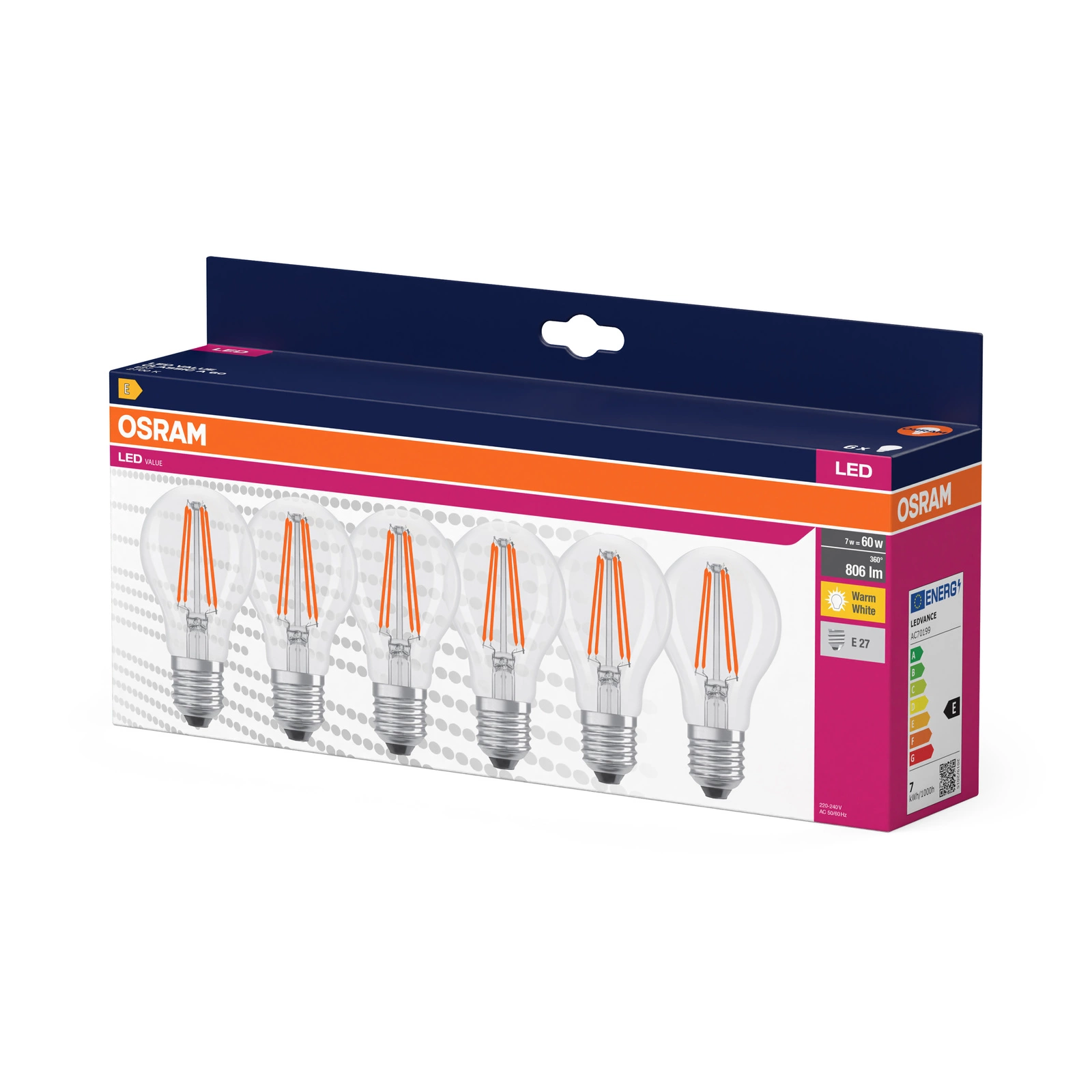 Objavte dokonalé riešenie osvetlenia so sadou 6 žiaroviek Osram LED s technológiou VALUE CLASSIC. Tieto najmodernejšie žiarovky sú ideálnou náhradou za tradičné 60W žiarovky a vďaka príkonu iba 6,5 W ponúkajú úsporu energie. Vyžarujú svetelný tok 806 lúmenov, čím poskytujú dostatok svetla pre väčšinu domácich a komerčných aplikácií. S farebnou teplotou 2700 K poskytujú príjemnú teplú bielu farbu svetla, ktorá je ideálna na vytvorenie útulnej atmosféry v interiéri.