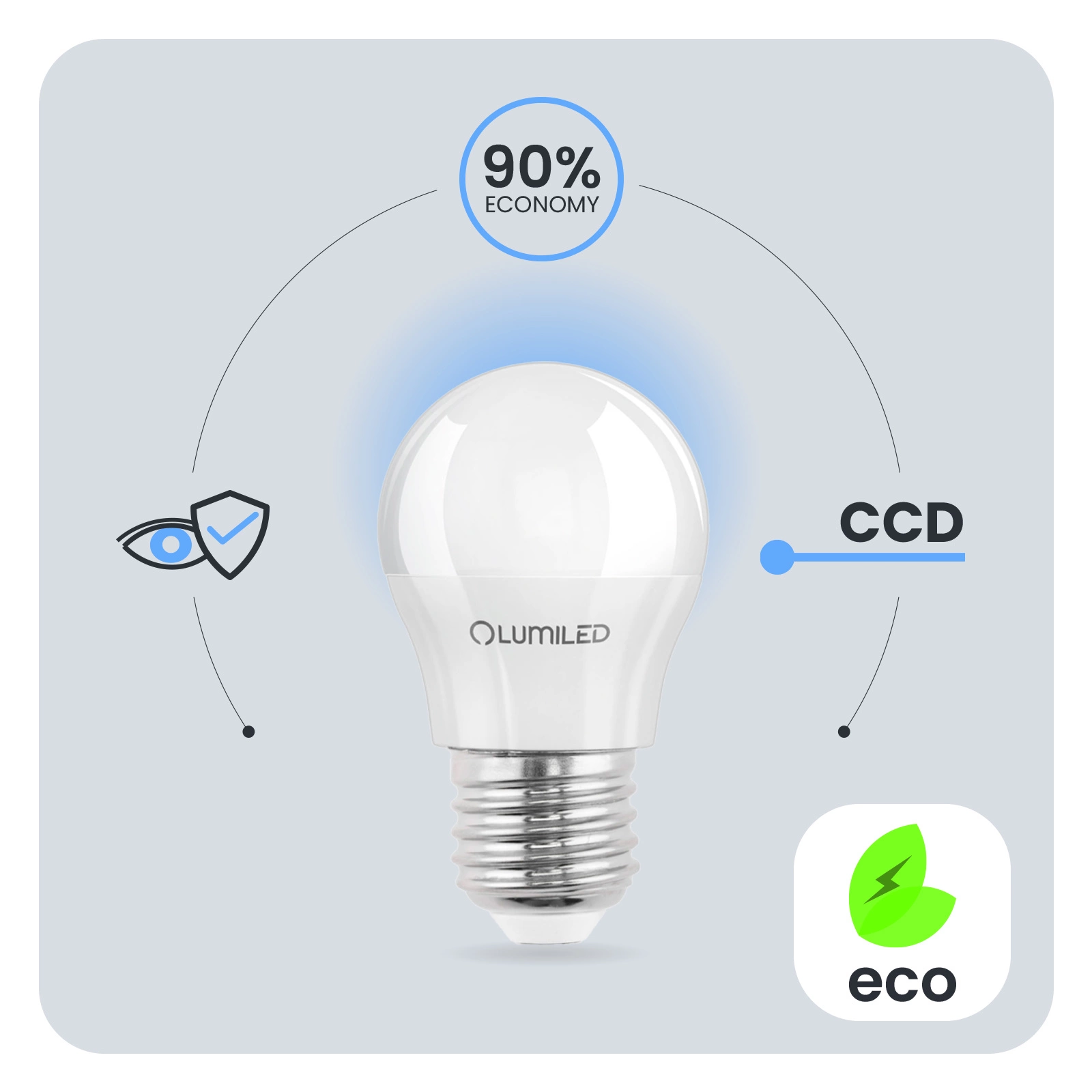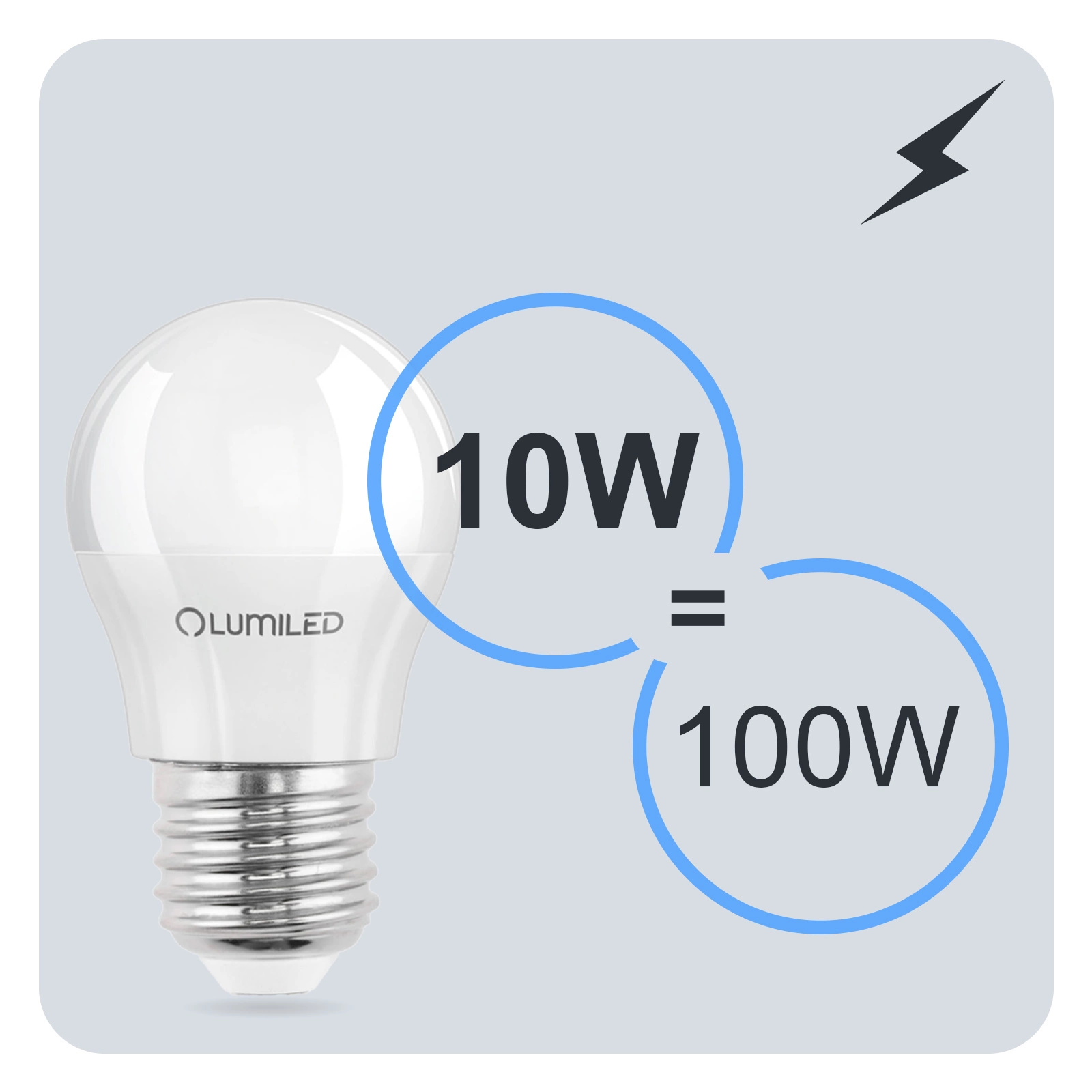Żarówka LED renomowanej i uznanej w branży oświetleniowej marki LUMILED w kształcie kulki z trzonkiem E27 i mocy 10W. Żarówka doskonale sprawdzi się w każdym gospodarstwie domowym, sklepie, hotelu czy restauracji jako oświetlenie akcentowe lub dekoracyjne i może być montowana we wszystkich tradycyjnych oprawach, które wyposażone są w trzonek E27.
