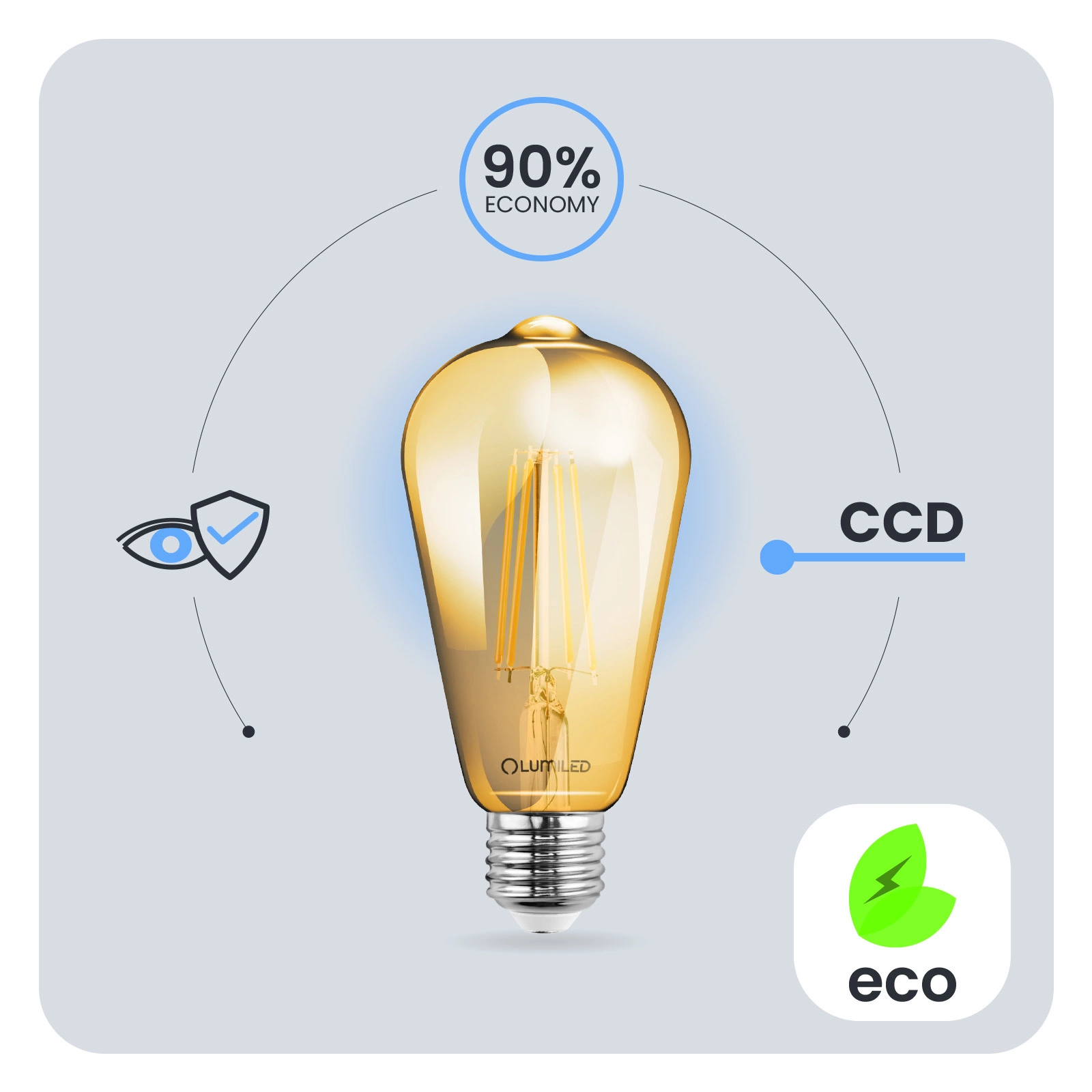 Vďaka CCD meniču použitému v LED žiarovke je žiarovka odolná voči poklesom a špičkám sieťového napätia. Svetlo nebliká ani sa netrasie. Vďaka CCD meniču je žiarovka dlhodobo bezchybná. Žiarovky LUMILED sú navrhnuté s ohľadom na používateľa. Zlá kvalita osvetlenia môže viesť k únave očí, preto majú naše žiarovky technický vývoj Eye Safe, ktorý zabezpečuje pohodlné a šetrné osvetlenie pre vaše oči v akejkoľvek miestnosti.