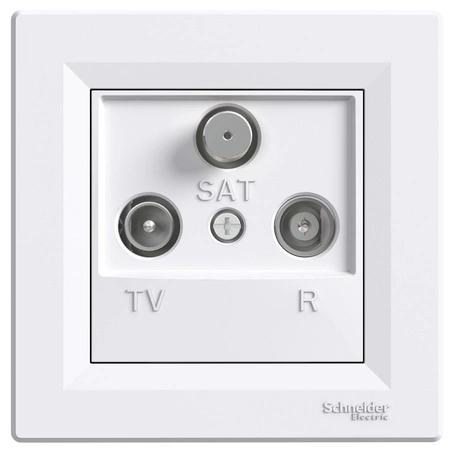 Gniazdo RTV-SAT przelotowe marki Schneider Electric z serii Asfora. Projekt produktu zapewnia łatwą, intuicyjną i szybką instalację, a także bezpieczeństwo. Wejścia kablowe są tak wyprofilowane, aby ułatwić umieszczenie przewodu w zacisku i zapewnić, że odsłonięta część przewodu znajdzie się pod warstwą izolacyjną.