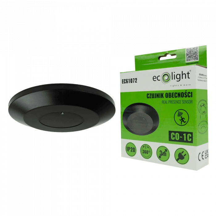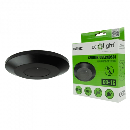 Objavte moderné riešenie pre vašu inteligentnú domácnosť - PIR CO-1C Senzor pohybu a súmraku od spoločnosti Ecolight. Tento elegantný čierny snímač je dokonalou kombináciou funkčnosti a štýlu, poskytuje účinné 360° pokrytie a dosah detekcie až 3 metre. Využíva technológiu pasívneho infračerveného snímača (PIR) a je ideálny pre kancelárie, obytné priestory a všetky oblasti, ktoré si vyžadujú automatizáciu osvetlenia.