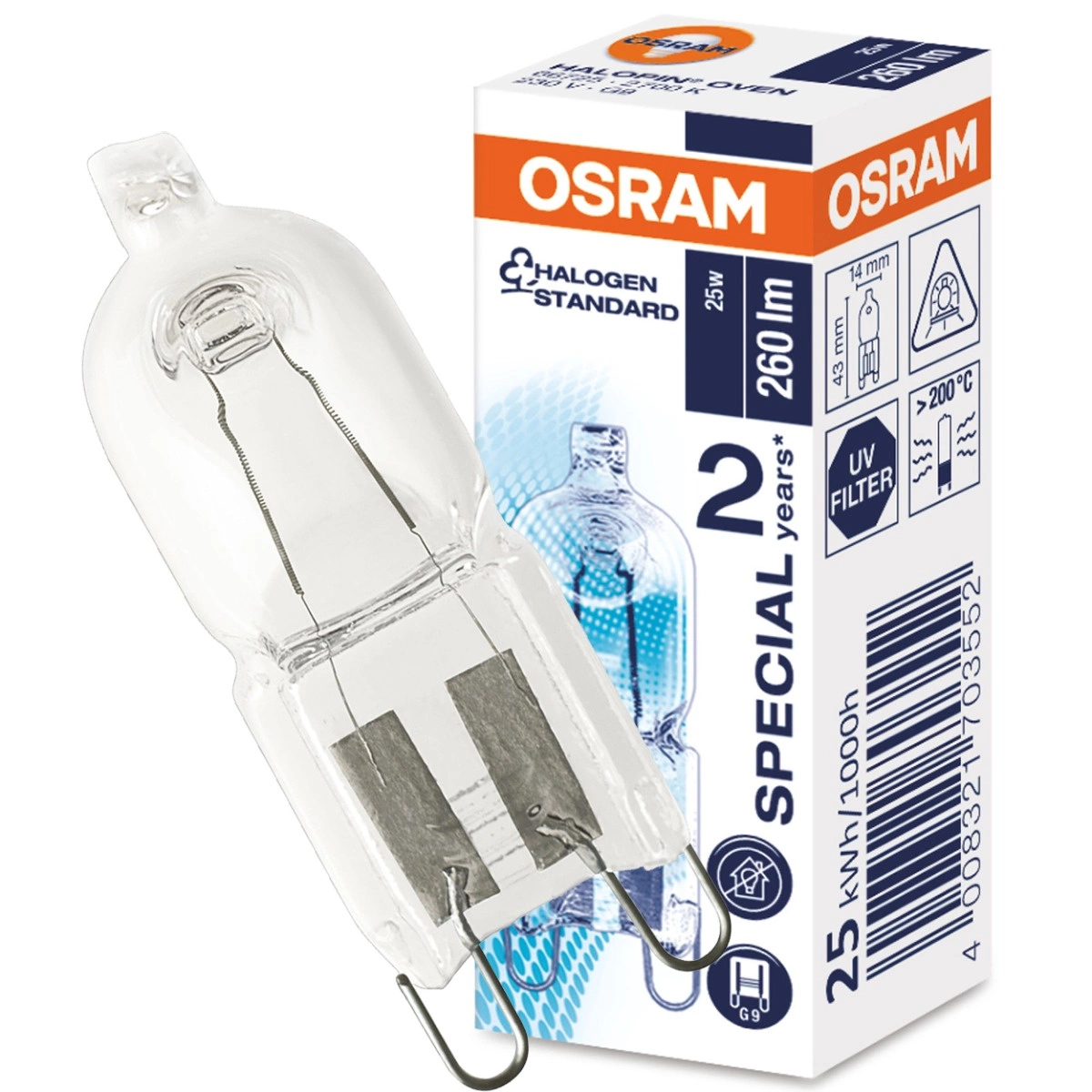 Żarówka HALOPIN OVEN KAPSUŁKA G9 230,V renomowanej i uznanej w branży oświetleniowej firmy OSRAM z trzonkiem G9 i mocy wynoszącej 25W, strumieniu świetlnym 260lm i ciepłej barwie światła 2700K to wysokiej jakości źródło światła odporne na wysokie temperatury. Świetnie sprawdzi się w takich miejscach jak piekarnik czy inne lampy pracujące w wysokich temperaturach. Kapsułka wykonana została przy użyciu rozwiązań wykorzystujących żarnik oraz szkło, które charakteryzują się dużą odpornością na temperaturę.