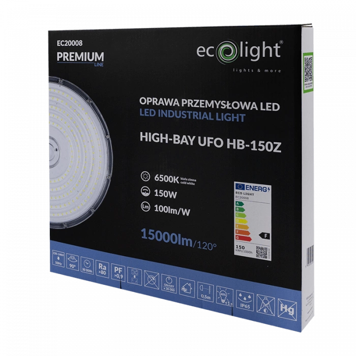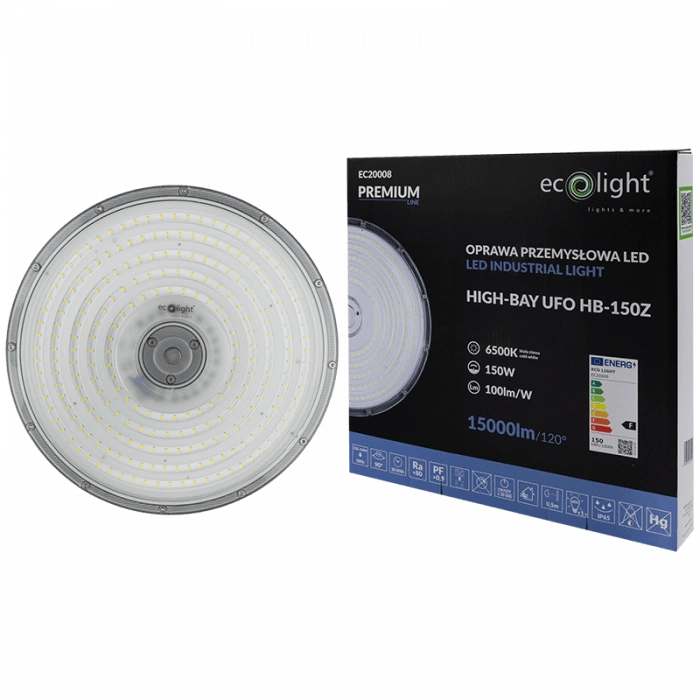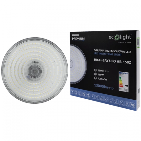 Priemyselné závesné LED svietidlo UFO HIGHBAY 150W 15000lm 6500K Cold IP65 PREMIUM Ecolight je moderné riešenie osvetlenia, ktoré spĺňa najnáročnejšie priemyselné požiadavky. S výkonom 150 W a svetelným tokom 15 000 lm zaručuje toto svietidlo optimálne osvetlenie veľkých priestorov. Je k dispozícii v studenej bielej far be s farebnou teplotou 6500 K a poskytuje jas a jasnosť dokonale prispôsobené pracovným podmienkam v garážach alebo výrobných halách. Robustná konštrukcia z hliníka a ABS v elegantnom sivom vyhotovení a priehľadná clona z nej robia estetickú a robustnú voľbu.