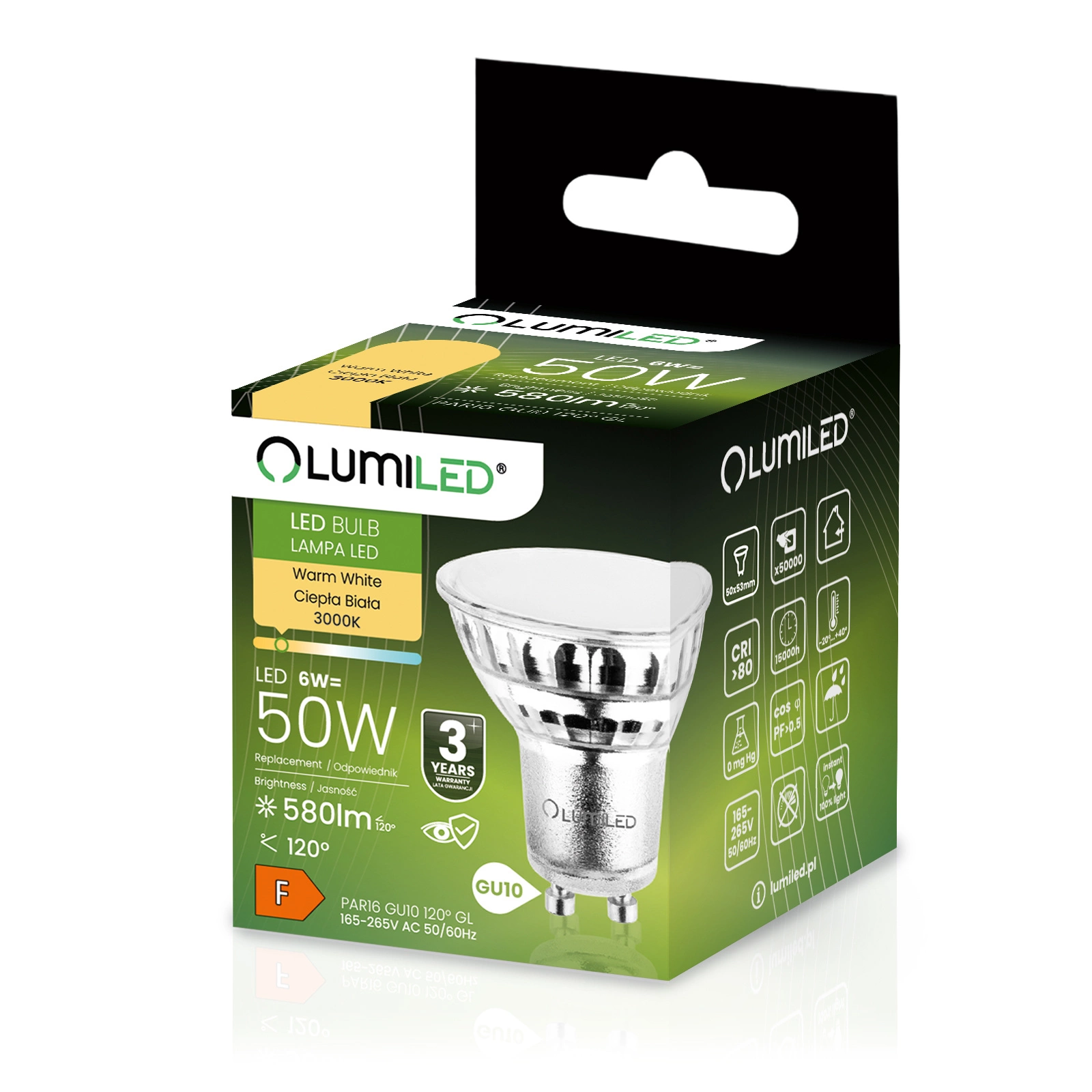 LED žiarovka od renomovanej značky LUMILED s päticou GU10 a výkonom 6 W je vynikajúcou náhradou za tradičné 50W žiarovky a ponúka úsporu energie a dlhšiu životnosť. Vyžaruje svetlo so svetelným tokom 580 lúmenov a teplou farbou 3 000 K, takže je ideálna na osvetlenie interiéru, kde sa vyžaduje mäkká, príjemná farba svetla. Uhol osvetlenia 120° umožňuje široký rozptyl svetla, čím účinne osvetľuje miestnosť. Vďaka kvalitnému spracovaniu má životnosť až 15 000 hodín, čo znamená mnoho rokov používania. Okrem toho pracuje v širokom rozsahu napätia 165-265 V a je vhodné na použitie pri teplotách okolia od -20 °C do +40 °C. Ideálna voľba pre tých, ktorí si cenia úsporu energie a starostlivosť o životné prostredie.