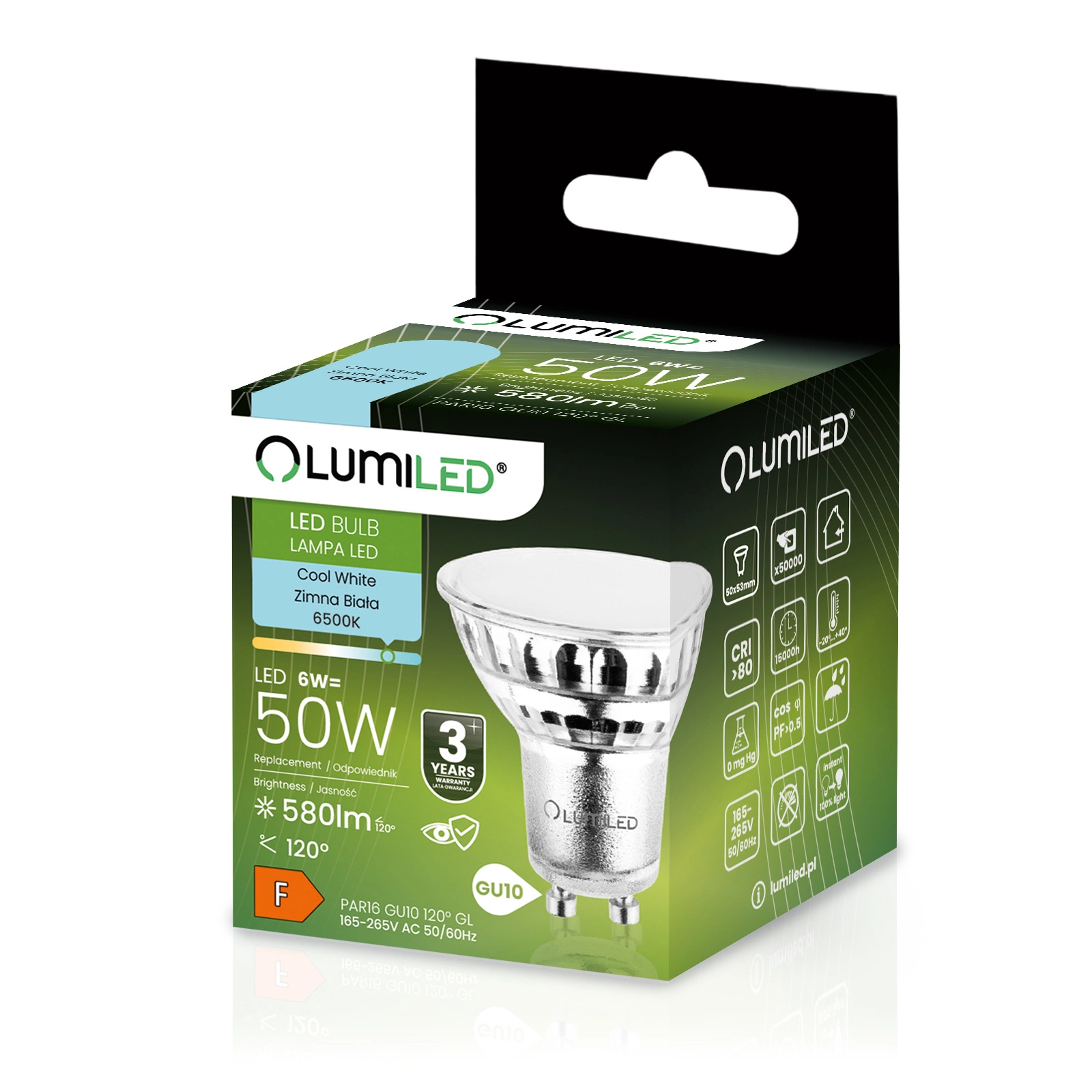 LED žiarovka od renomovanej značky LUMILED s päticou GU10 a výkonom 6 W je vynikajúcou náhradou za tradičné 50W žiarovky a ponúka úsporu energie a dlhšiu životnosť. Vyžaruje svetlo so svetelným tokom 580 lúmenov a studenou farbou 6500 K, takže je ideálna na osvetlenie interiéru, kde sa vyžaduje výrazná biela farba svetla. Uhol vyžarovania 120° umožňuje široký rozptyl svetla, čím účinne osvetľuje miestnosť. Vďaka kvalitnej konštrukcii má životnosť až 15 000 hodín, čo znamená mnoho rokov používania. Okrem toho pracuje v širokom rozsahu napätia 165-265 V a je vhodný na použitie pri teplotách okolia od -20 °C do +40 °C. Ideálna voľba pre tých, ktorí si cenia úsporu energie a starostlivosť o životné prostredie.