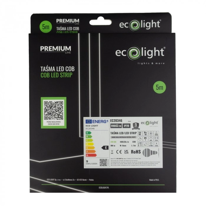 Objavte novú dimenziu osvetlenia s LED pásikom COB od spoločnosti Ecolight! Tento osvetľovací pásik je ideálnym riešením pre vašu domácnosť a spája modernú technológiu s elegantným dizajnom. Ponúka svetelný výkon 9 W na meter a poskytuje jasné, energeticky úsporné a dlhotrvajúce osvetlenie. Vďaka farebnej teplote 4000 K pásik vyžaruje neutrálne biele svetlo, ktoré je ideálne pre každodenné priestory, ako je obývacia izba, spálňa alebo jedáleň.