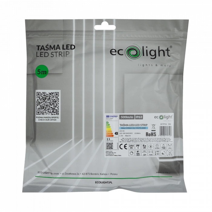Poskytnite svojim priestorom moderné a štýlové osvetlenie pomocou našej pásky Ecolight LED. Vďaka pokročilej technológii SMD 2835 LED páska ponúka svetelný tok 2500 lm na rolku, čo zaručuje jasné, rovnomerné a efektívne dekoratívne a praktické osvetlenie. S výkonom 10,8 W/m a menovitým napätím 24 V je pás LED úsporný a ideálny na dlhodobé používanie v domácnostiach a komerčných priestoroch.