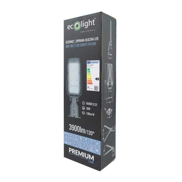 30W pouličná lampa LED je špičkové riešenie osvetlenia od spoločnosti Ecolight, ideálne pre vonkajšie mestské a cestné aplikácie. S výkonom 30 W a pôsobivou svetelnou účinnosťou 130 lm/W lampa poskytuje svetelný tok 3900 lm, čím zabezpečuje jasné a účinné osvetlenie cieľovej oblasti. Vďaka studenej farbe svetla 6500 K sa dokonale hodí do priestorov, ktoré si vyžadujú intenzívne osvetlenie. Integrovaný zdroj LED s vysokým indexom podania farieb Ra 80 zaručuje dlhý čas prevádzky a nízku spotrebu energie.