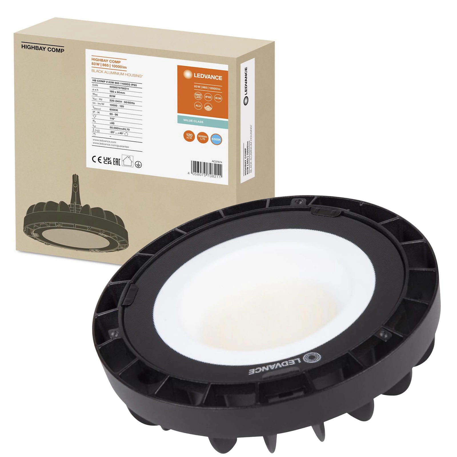 LED priemyselné svietidlo 83W 10000lm 6500K, studená biela Black IP65 IK06 High Bay Compact Ledvance