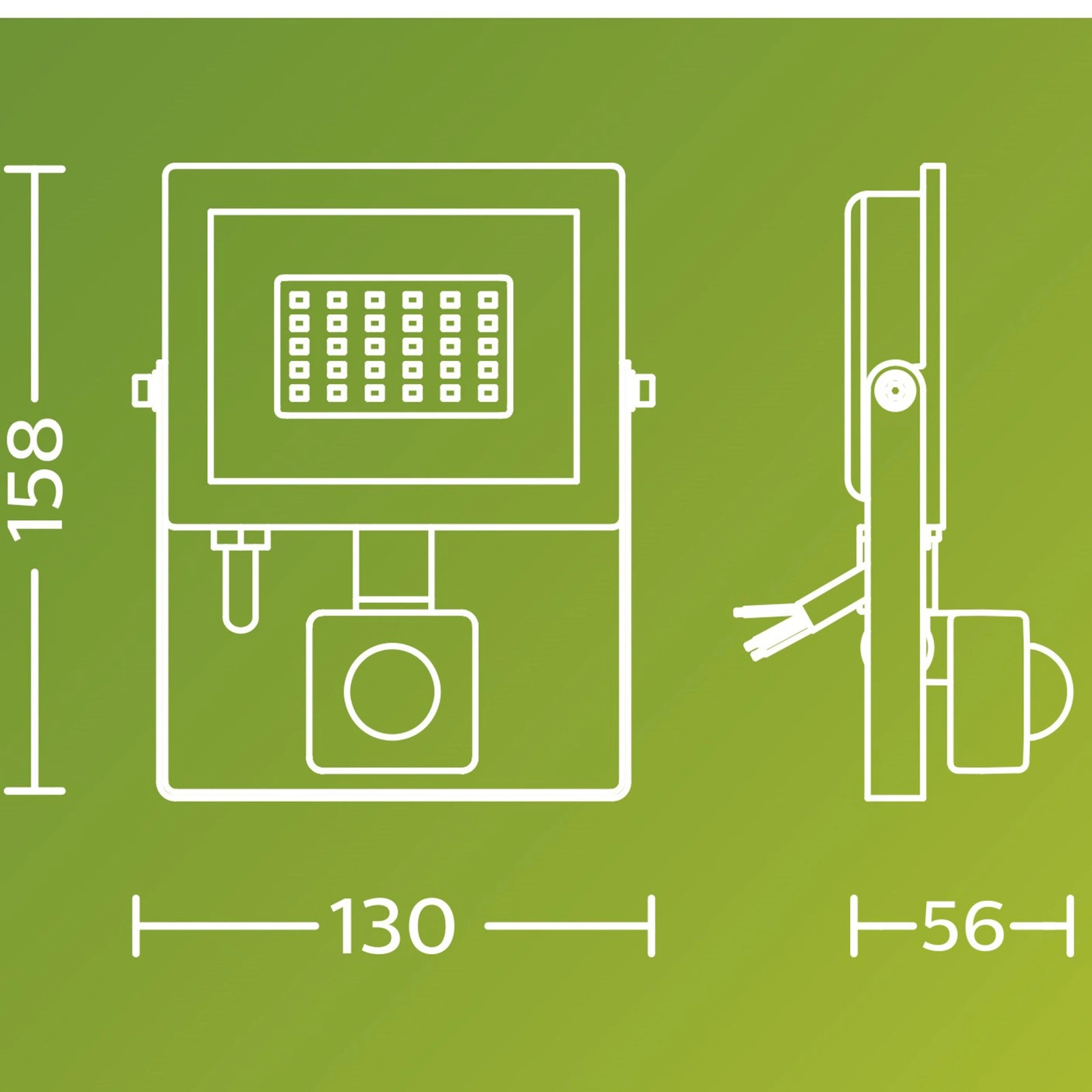 Reflektor je vybavený pokročilým snímačom pohybu a súmraku, ktorý automaticky zapne svetlo pre pohodlie a energetickú účinnosť. Vďaka detekčnému dosahu až 8 metrov a širokému detekčnému uhlu 120° zariadenie reaguje na prítomnosť aj vo veľkom rozsahu. Vďaka životnosti až 50 000 hodín a širokému uhlu rozloženia svetla 180° je tento reflektor spoľahlivou voľbou pre každého, kto hľadá odolný a účinný zdroj svetla. Elegantný, moderný tvar dokonale zapadne do každého prostredia a dodá mu nádych elegancie a štýlu.