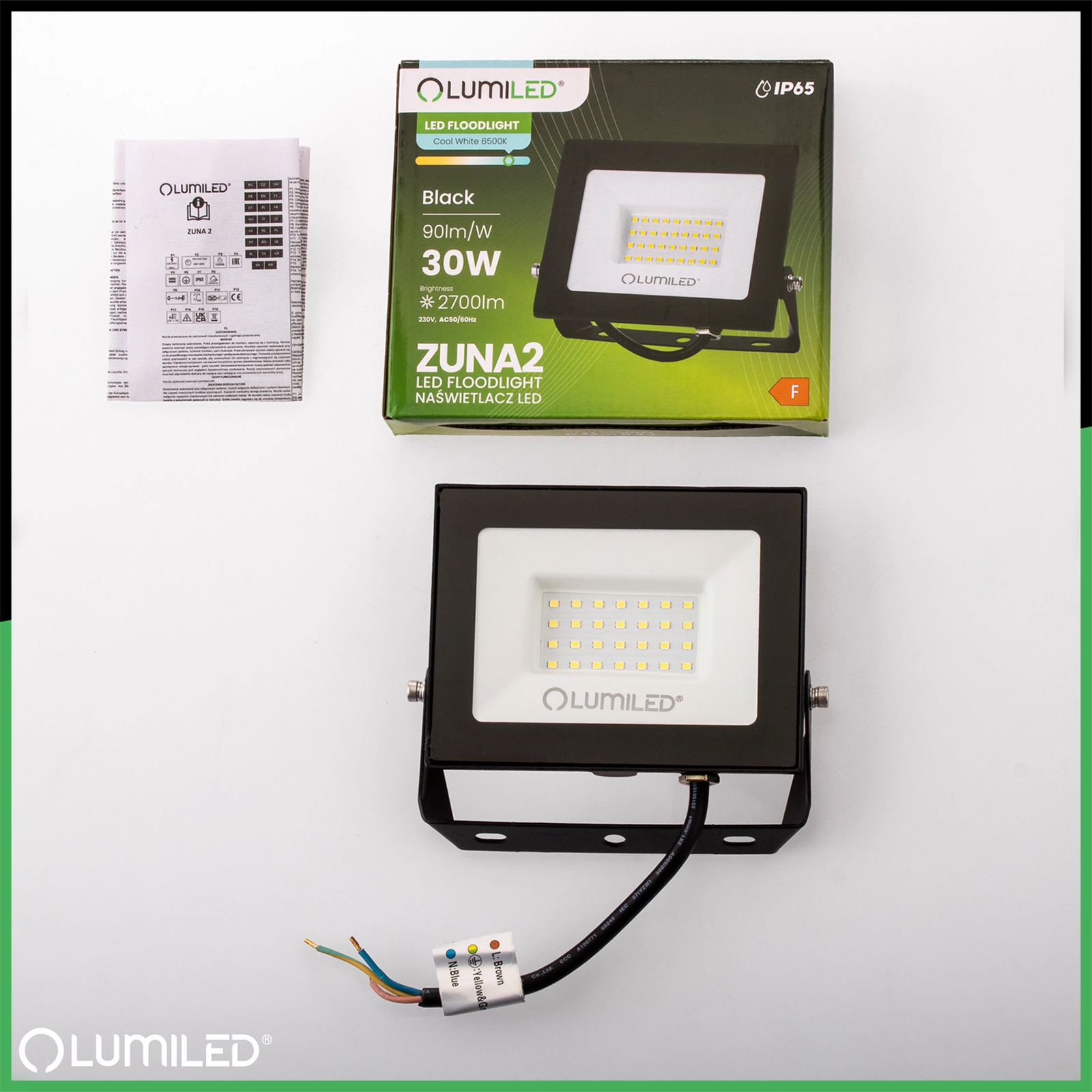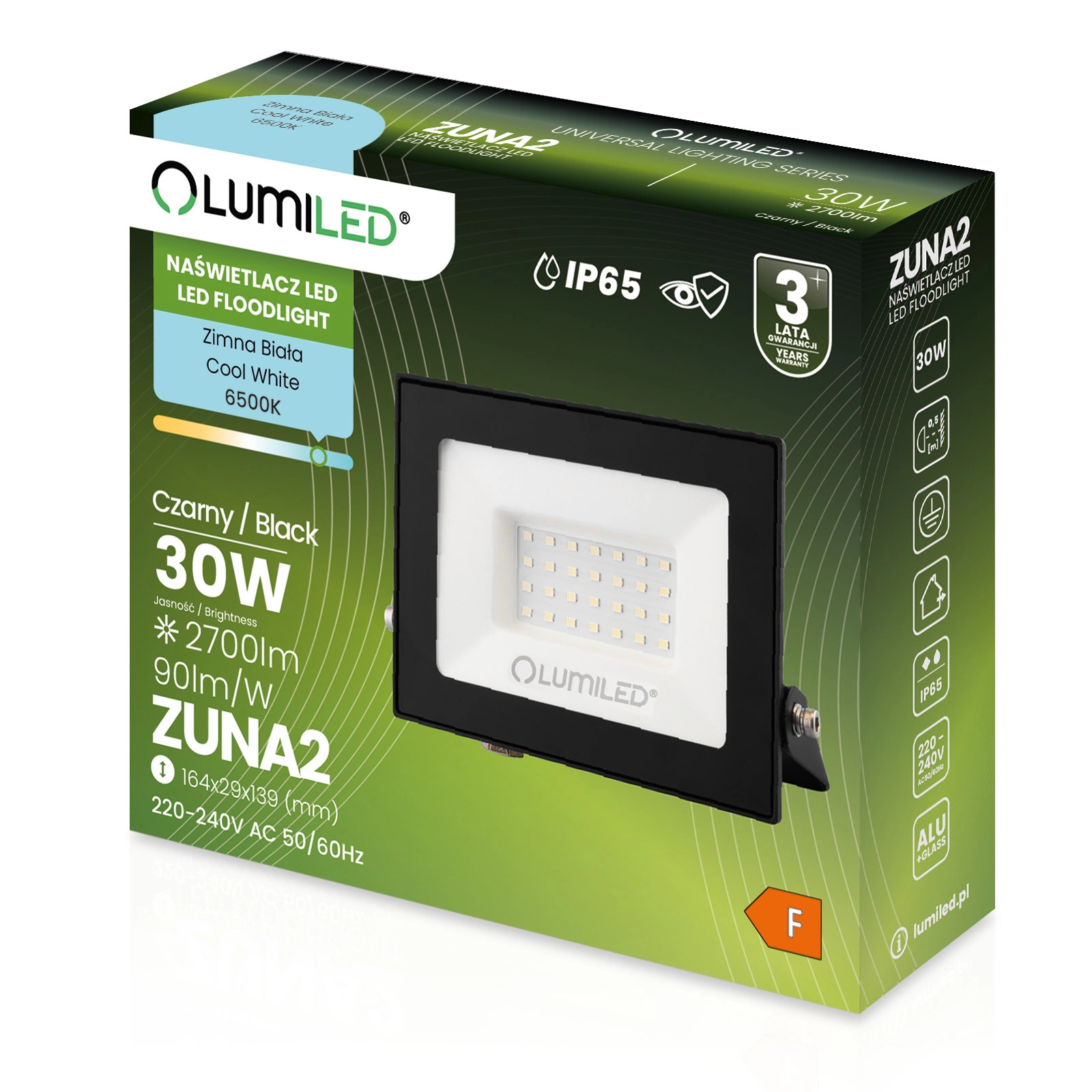LED reflektor ZUNA2 je vybavený 30W energeticky úsporným LED svetelným zdrojom a studenou farbou svetla s farebnou teplotou 6500 K , ktorá poskytuje osvetlenie na úrovni 2700 lm - čo dáva svetelný tok 90 lm/W.