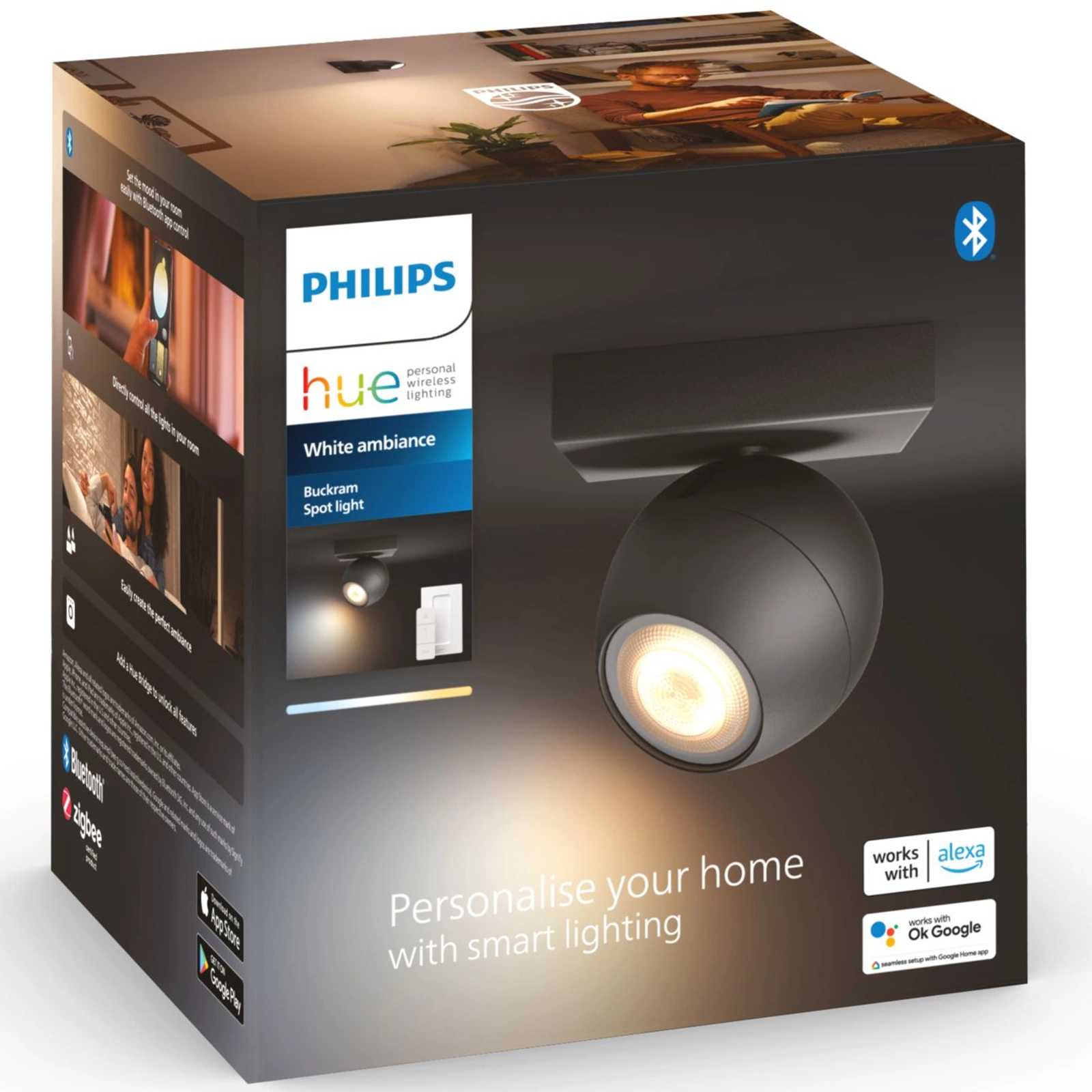 Lampa punktowa HUE LED Buckram renomowanej i cenionej w branży oświetleniowej firmy Philips. Nowoczesny kinkiet wyposażony w żarówkę LED z trzonek GU10 o mocy 5W i bardzo wydajny strumień świetlny - 350lm. Emituje przyjemne i relaksujące światło z możliwością regulacji temperatury barwy w zakresie od przyjemnej ciepłej poprzez neutralną, aż do zimnej, za pomocą których możemy stworzyć nastrój odpowiedni na każdą okazję. Dzięki stylowej obudowie doskonale komponuje się z domowym wystrojem. Lampa HUE LED Buckram może działać samodzielnie lub jako element inteligentnego systemu oświetlenia dzięki połączeniu z mostkiem Hue. Łatwo włączaj i wyłączaj światła, przyciemniaj, rozjaśniaj oraz wybieraj spośród czterech różnych scen świetlnych.