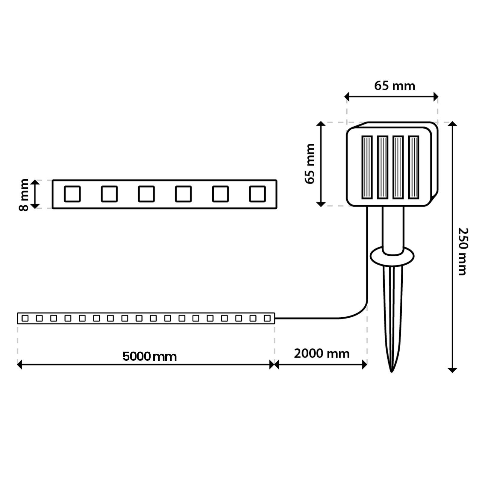 Solárny pás je vyrobený z pevných a odolných materiálov, ktoré zaručujú dlhodobú a spoľahlivú prevádzku v rôznych poveternostných podmienkach. Vďaka vysokému stupňu krytia IP44 je chránený proti vlhkosti, dažďu a prachu, čo je skvelé na vonkajšie použitie. Flexibilný dizajn umožňuje pásku ľahko prispôsobiť zakriveným okrajom alebo nepravidelným povrchom. Použité materiály sú odolné voči UV žiareniu, takže páska nevybledne ani nestratí svoju farbu ani pri dlhodobom vystavení slnku.