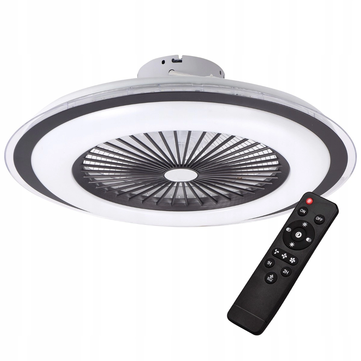 Nowoczesny żyrandol LED Rodos wentylator. Wyposażony został w 64 diod SMD 2835 LED, które posiadają opcję ściemniania oraz zmiany barwy światła. Do regulacji pracy urządzenia służy dedykowany pilot (w zestawie), który pozwala nam na zmniejszanie bądź zwiększanie intensywności światła lub zmianę jego barwy z ciepłej na neutralna, lub zimną. Pilot działa radiowo co oznacza, że nie musimy celować w konkretny punkt w celu zmiany ustawień.