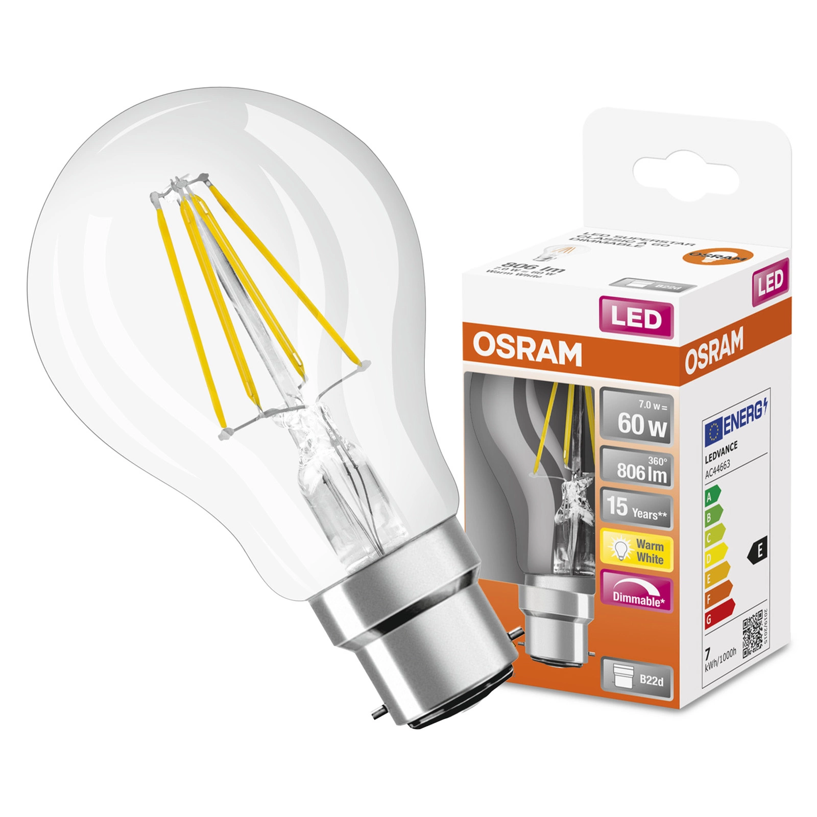 Objavte modernú technológiu osvetlenia so žiarovkou Osram Retrofit Classic LED. Táto žiarovka s päticou A60 s päticou B22d zaručuje vynikajúci výkon a ponúka svetelný tok 806 lm, čo zodpovedá tradičnej 60W žiarovke, pričom spotrebuje iba 7 W energie. Vďaka vysokej svetelnej účinnosti 116 lm/W a životnosti až 15 000 hodín si môžete dlhšie vychutnávať teplú žiaru s teplotou 2700 K, ktorá vytvára útulnú atmosféru v každej miestnosti.