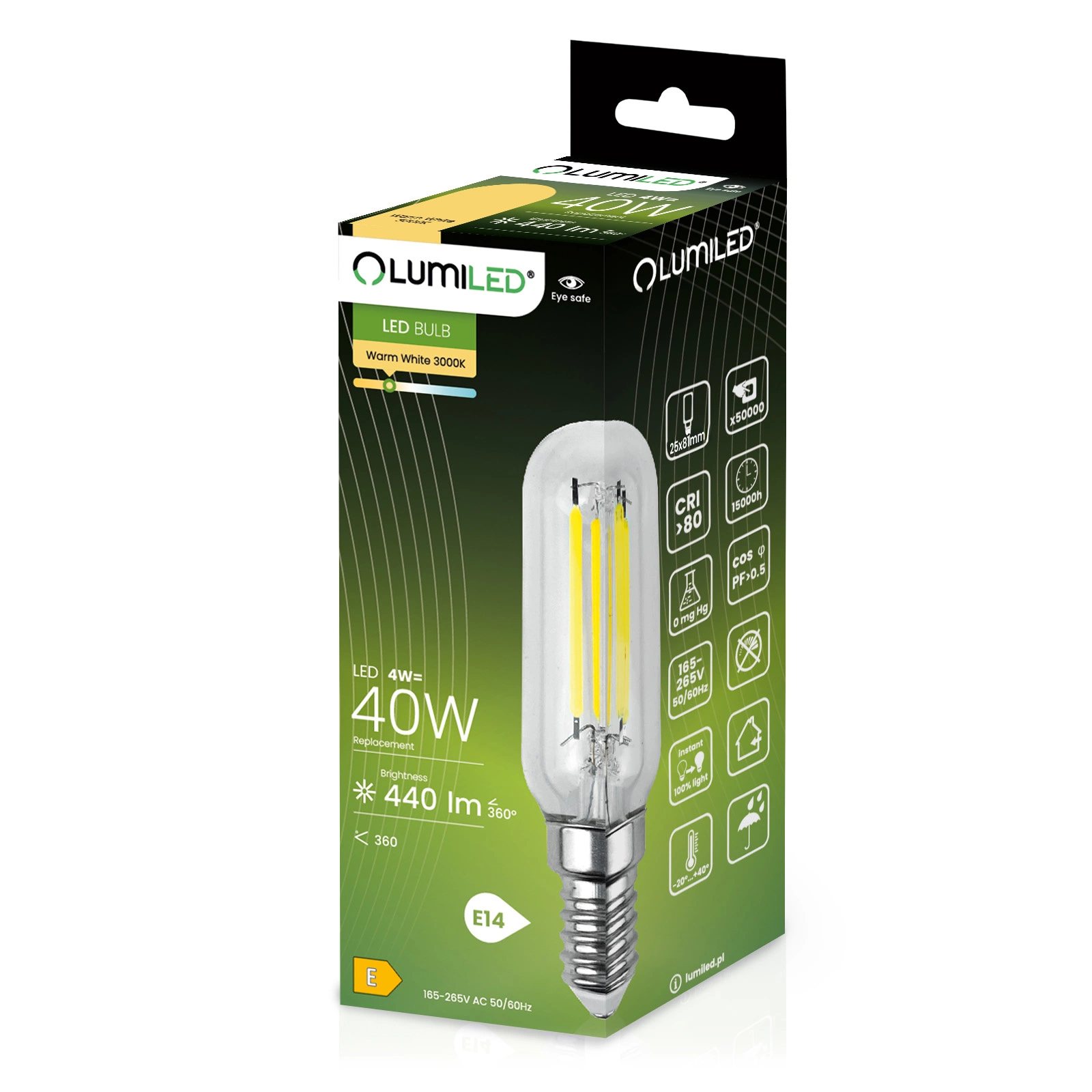 LED žiarovka od renomovanej značky LUMILED s päticou E14 a výkonom 4 W je vynikajúcou náhradou za tradičné 40W žiarovky a ponúka úsporu energie a dlhšiu životnosť. Vyžaruje svetlo so svetelným tokom 470 lúmenov a teplou farbou 3 000 K, takže je ideálna na osvetlenie interiéru, kde sa vyžaduje mäkká, príjemná farba svetla. Uhol osvetlenia 360° umožňuje široký rozptyl svetla, čím účinne osvetľuje miestnosť. Vďaka kvalitnému spracovaniu má životnosť až 15 000 hodín, čo znamená mnoho rokov používania. Okrem toho pracuje v širokom rozsahu napätia 165-265 V a je vhodné na použitie pri teplotách okolia od -20 °C do +40 °C. Ideálna voľba pre tých, ktorí si cenia úsporu energie a starostlivosť o životné prostredie.