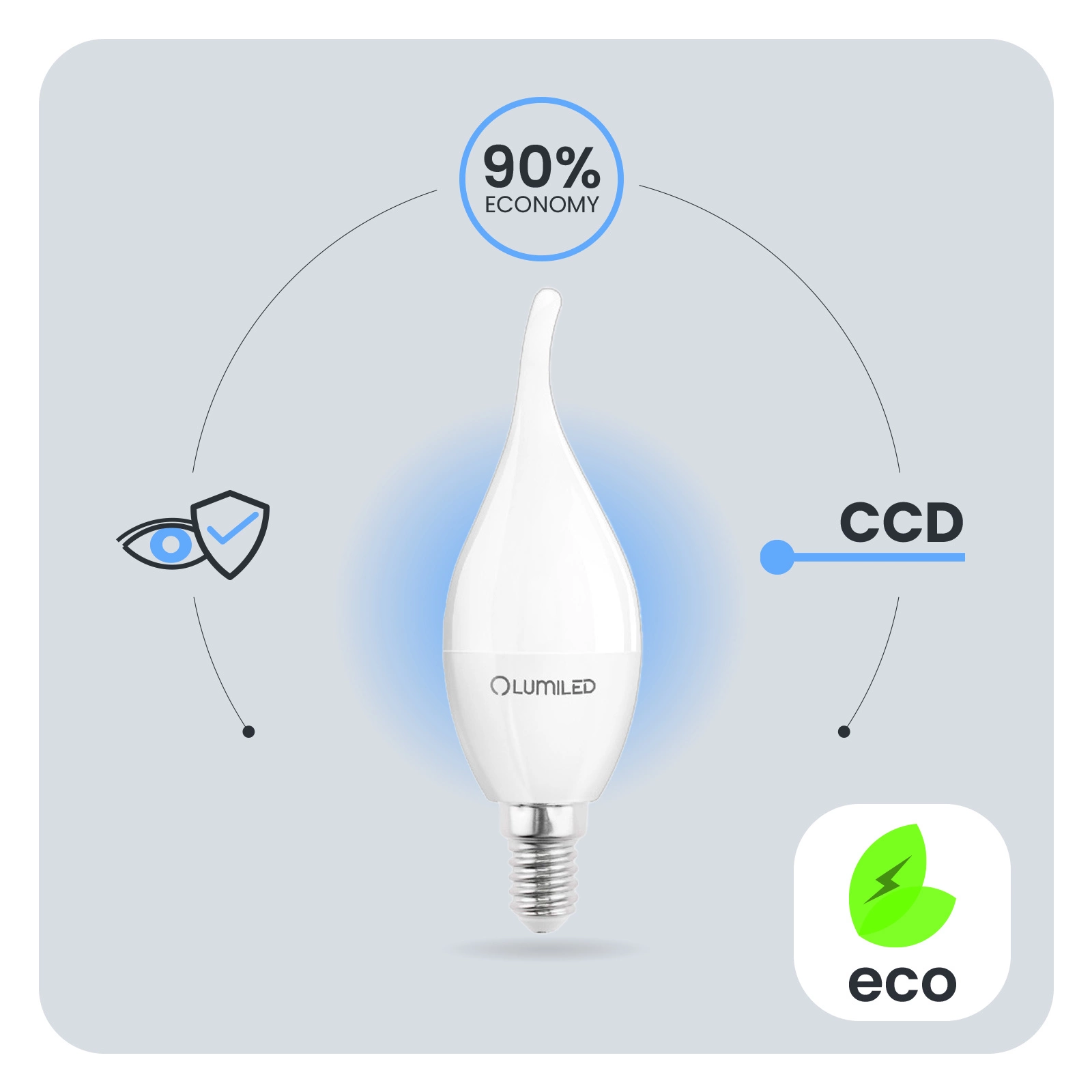 Vďaka CCD meniču použitému v LED žiarovke je žiarovka odolná voči poklesom a špičkám sieťového napätia. Svetlo nebliká ani sa netrasie. Vďaka CCD meniču je žiarovka dlhodobo bezchybná. Žiarovky LUMILED sú navrhnuté s ohľadom na používateľa. Zlá kvalita osvetlenia môže viesť k únave očí, preto majú naše žiarovky technický vývoj Eye Safe, ktorý zabezpečuje pohodlné a šetrné osvetlenie pre vaše oči v akejkoľvek miestnosti.