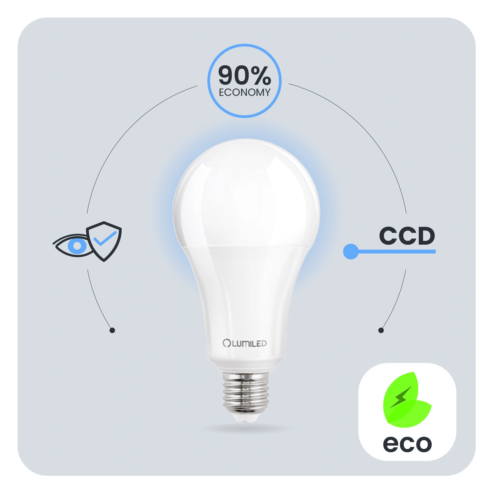 Vďaka CCD meniču použitému v LED žiarovke je žiarovka odolná voči poklesom a špičkám sieťového napätia. Svetlo nebliká ani sa netrasie. Vďaka CCD meniču je žiarovka dlhodobo bezchybná. Žiarovky LUMILED sú navrhnuté s ohľadom na používateľa. Zlá kvalita osvetlenia môže viesť k únave očí, preto majú naše žiarovky technický vývoj Eye Safe, ktorý zabezpečuje pohodlné a šetrné osvetlenie pre vaše oči v akejkoľvek miestnosti.