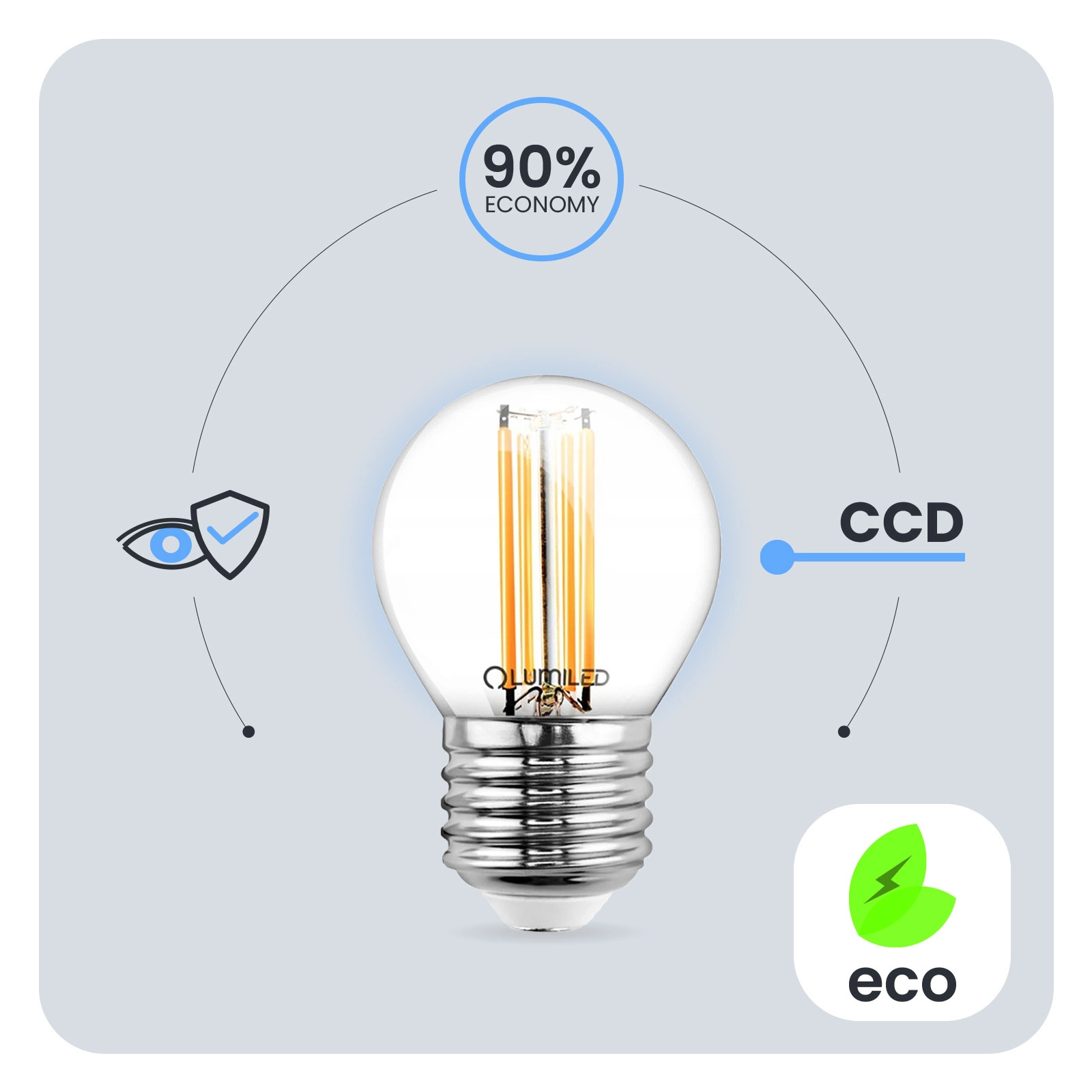 Vďaka CCD meniču použitému v LED žiarovke je žiarovka odolná voči poklesom a špičkám sieťového napätia. Svetlo nebliká ani sa netrasie. Vďaka CCD meniču je žiarovka dlhodobo bezchybná. Žiarovky LUMILED sú navrhnuté s ohľadom na používateľa. Zlá kvalita osvetlenia môže viesť k únave očí, preto majú naše žiarovky technický vývoj Eye Safe, ktorý zabezpečuje pohodlné a šetrné osvetlenie pre vaše oči v akejkoľvek miestnosti.