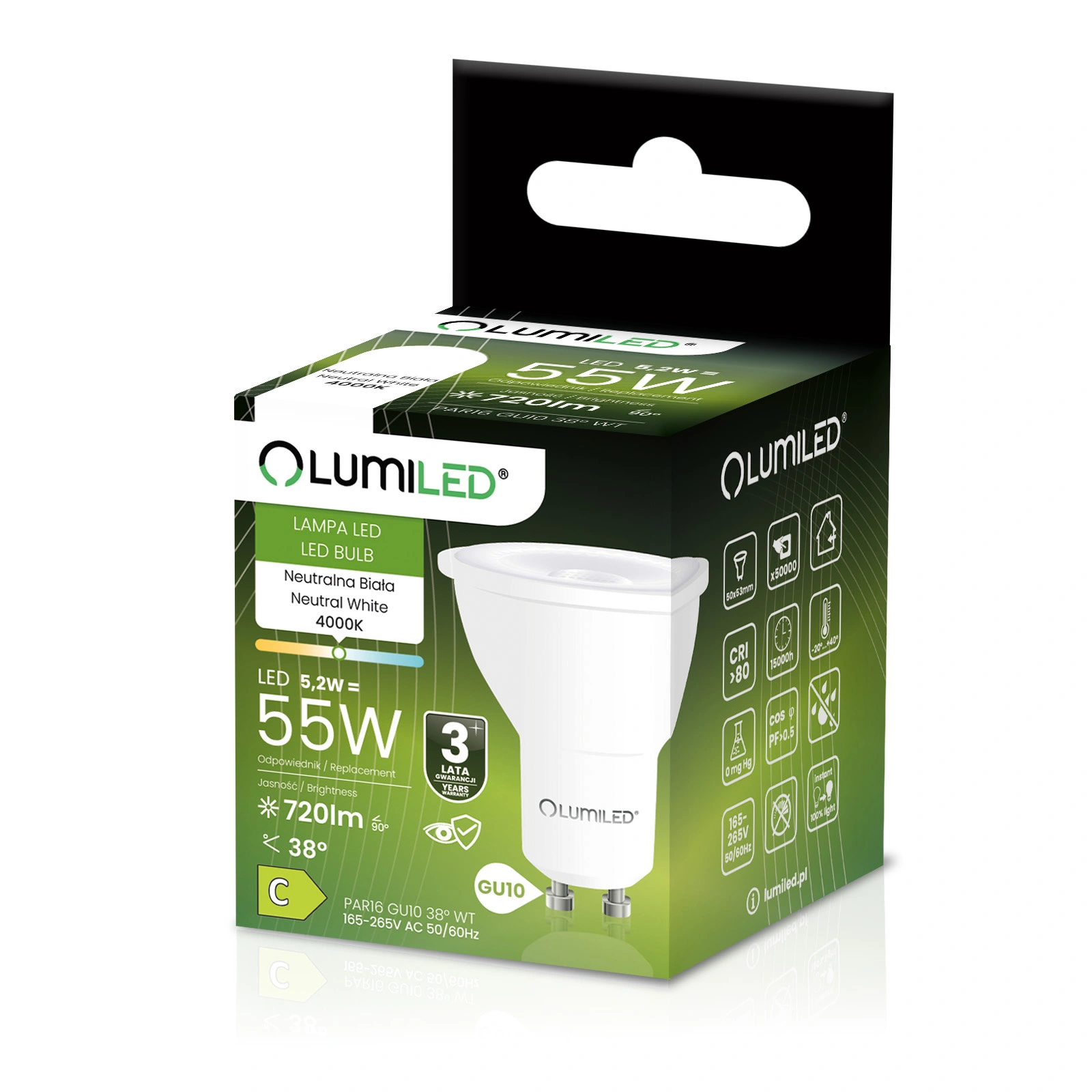 GU10 5,2W LED žiarovka od spoločnosti Lumiled je ideálnou voľbou pre tých, ktorí potrebujú jasné a presné osvetlenie, pričom je energeticky úsporná. Vyžaruje neutrálnu farbu 4000 K a ponúka prirodzené, jasné svetlo ideálne pre kuchyne, kancelárie, chodby alebo akcentové osvetlenie. Svetelný tok 720 lm zodpovedá tradičnej 55W žiarovke a poskytuje jasné, príjemné svetlo bez blikania. So zameraným uhlom vyžarovania 38° reflektor presne osvetľuje vybrané oblasti, zvýrazňuje detaily a vytvára výrazné svetelné efekty. Je skvelou voľbou tam, kde je dôležitá funkčnosť a cielené svetlo.