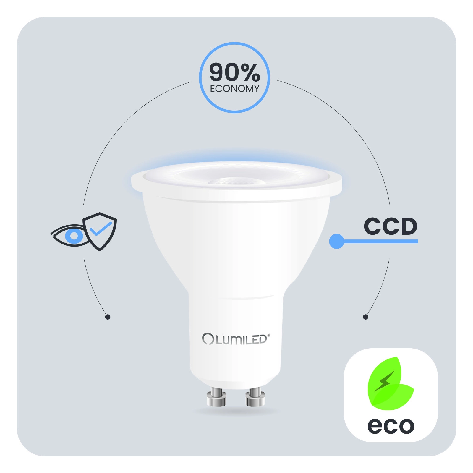 Vďaka CCD meniču použitému v LED žiarovke je žiarovka odolná voči poklesom a špičkám sieťového napätia. Svetlo nebliká ani sa netrasie. Vďaka CCD meniču je žiarovka dlhodobo bezchybná. Žiarovky LUMILED sú navrhnuté s ohľadom na používateľa. Zlá kvalita osvetlenia môže viesť k únave očí, preto majú naše žiarovky technický vývoj Eye Safe, ktorý zabezpečuje pohodlné a šetrné osvetlenie pre vaše oči v akejkoľvek miestnosti.