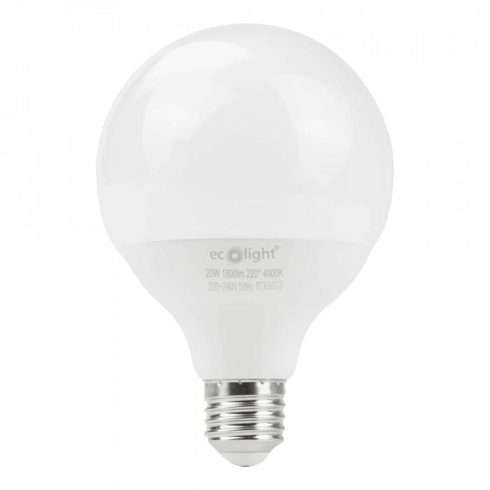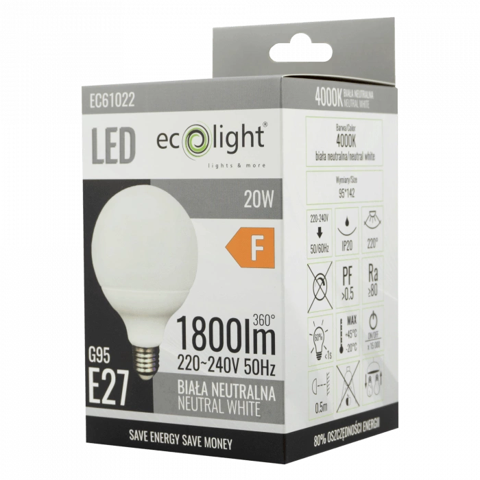 Rozsvieťte svoje interiéry pomocou LED žiarovky G95 E27 20W 1800lm 4000K od spoločnosti Ecolight. Táto žiarovka v sebe spája moderný dizajn a vysokú energetickú účinnosť, vďaka čomu je ideálnou voľbou do každej miestnosti. Vďaka svojej neutrálnej bielej farbe(4000 K) poskytuje dokonalé pracovné prostredie a vytvára príjemnú atmosféru v celom dome. Jej výkon(20 W) umožňuje generovať intenzívny svetelný tok(1800 lm), čím nahrádza tradičné svetelné zdroje s výrazne nižšou spotrebou energie.