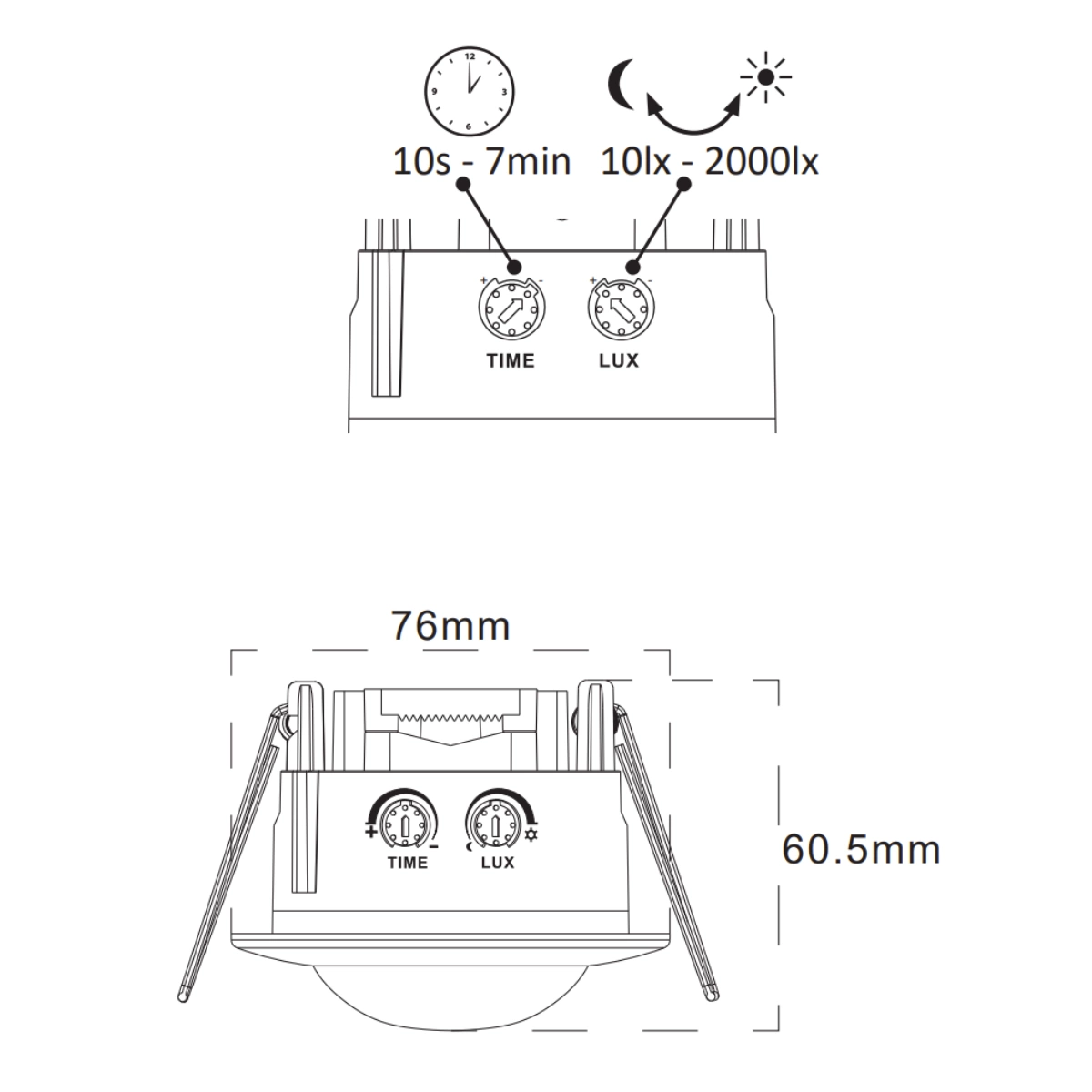 - Nastaviteľné svetlo a čas chodu - úroveň intenzity svetla (LUX) a čas chodu senzora možno nastaviť podľa potrieb používateľa.