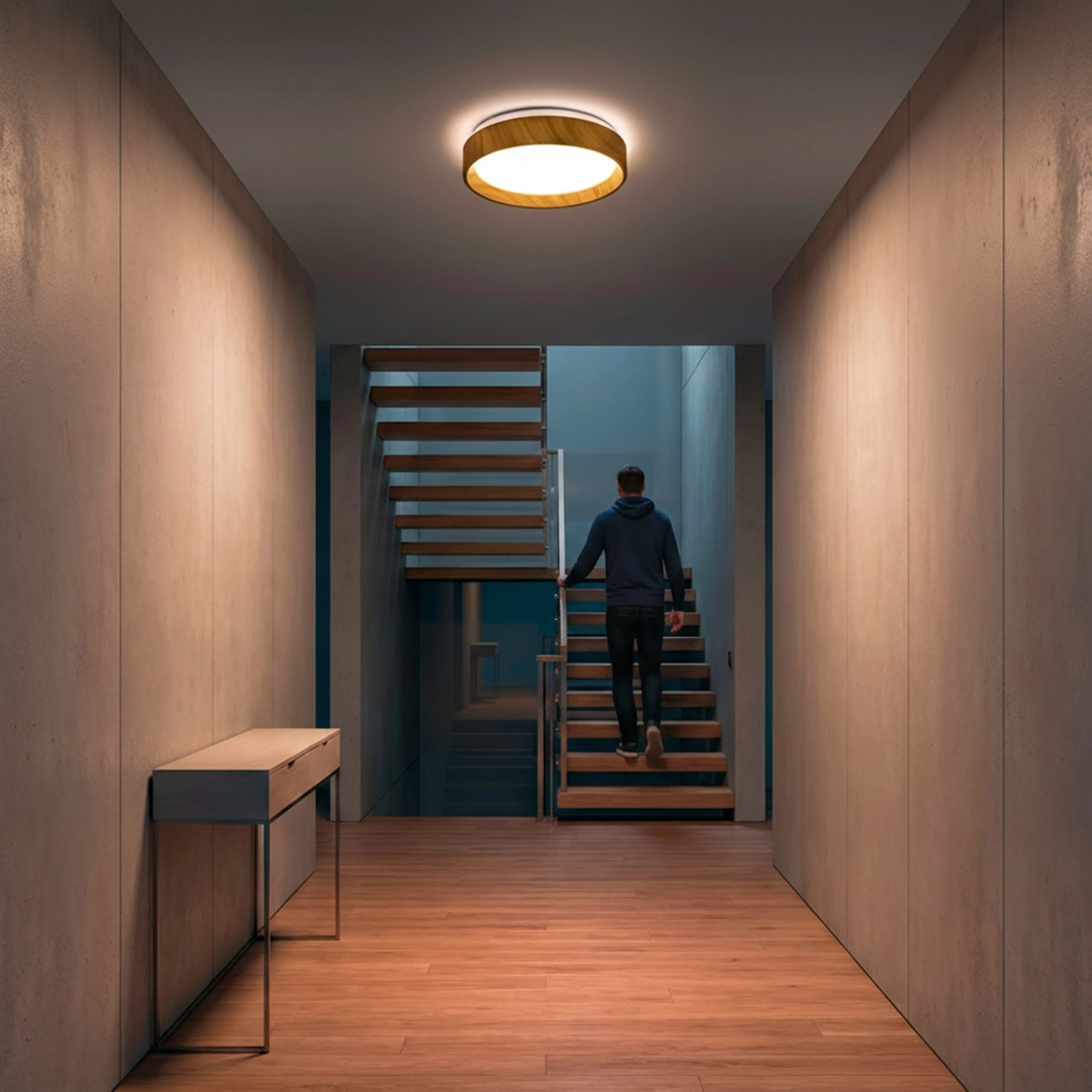 Povrchová montáž umožňuje rýchlu inštaláciu plafónu bez zásahu do stropu a bez ďalších dokončovacích prác. Farebná úprava inšpirovaná drevom opticky zateplí interiér a kruhový tvar pomáha ihneď po inštalácii vytvoriť jednotný a čistý efekt. Výsledkom je, že svietidlo dobre zapadá do usporiadania a esteticky uzatvára vzhľad stropu.