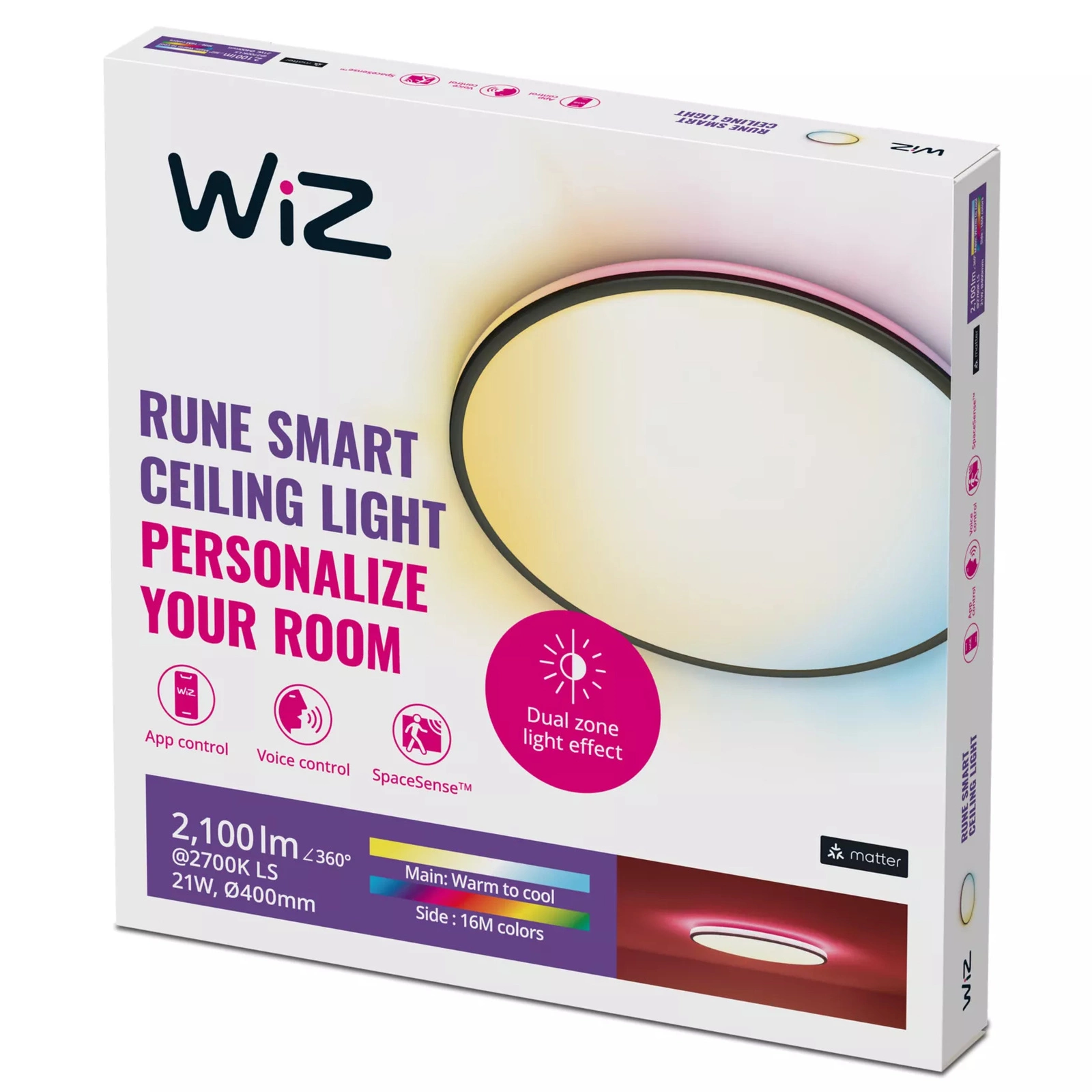 Pokročilá technológia SMART umožňuje ovládať svetlo prostredníctvom WiFi, Bluetooth alebo Matter, pričom ponúka pohodlie z aplikácie WiZ Connected. Nemusíte vstávať z pohovky, aby ste zmenili náladu v miestnosti - stačí niekoľko kliknutí na smartfóne. Plafón vyrobený z odolného plastu ponúka životnosť 20000 hodín a spĺňa normy IP20, takže je ideálnou voľbou na použitie v interiéri. Lampa sa vyznačuje zhodou s normami CE a RoHS, čo je zárukou kvality a bezpečného používania. Vyberte si WiZ Rune a užite si moderné osvetlenie, ktoré spája štýl s funkčnosťou!