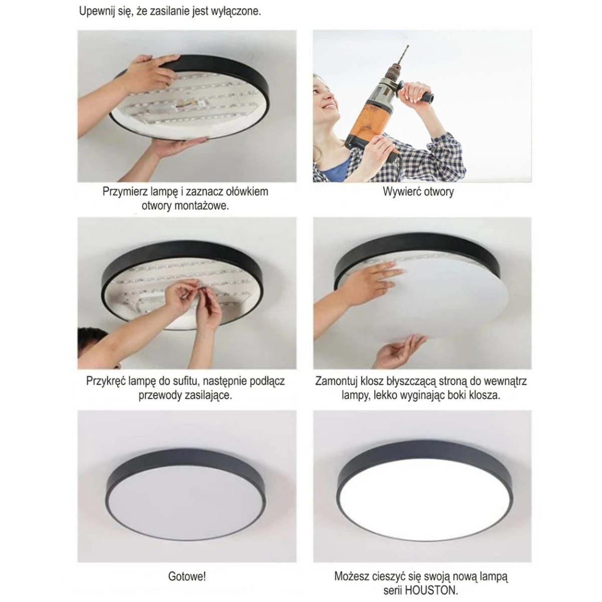 Okrągły Plafon LED serii HOUSTON w kolorze czarno-białym i średnicy 40cm. Lampa ze wbudowanym źródłem światła LED, klasy A++ - A, które jest bardzo energooszczędne. Diody LED zapewniają mniejsze o nawet 90% zużycie energii względem innych tradycyjnych źródeł światła. Lampa o mocy 36W emituje światło o neutralnej, nieoślepiającej barwie światła, generując strumień świetlny na poziomie aż 3240 lm. Zastosowane diody LED w lampie gwarantują jej wysoką trwałość oraz skuteczność świetlną, dzięki czemu pojedyncza Lampa może stanowić główne oświetlenie średniego i większego pomieszczenia.