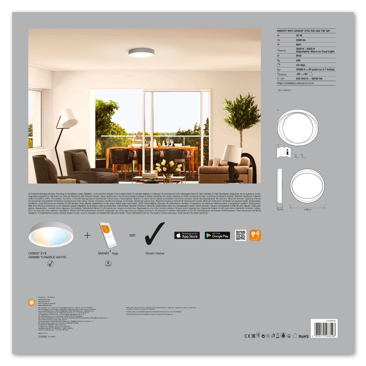 Okrúhly tvar a elegantná sivá farba robia z lampy štýlový doplnok každého moderného interiéru. Životnosť 30000 hodín a jednoduchá inštalácia na povrch z nej robia funkčné a dlhotrvajúce riešenie. Vďaka protokolu WiFi SMART+ možno lampu ovládať na diaľku prostredníctvom smartfónu, čo ju robí mimoriadne pohodlnou na každodenné používanie. Jej technické parametre, ako napríklad IP20 a index podania farieb Ra 80, svedčia o vysokej kvalite jej spracovania.