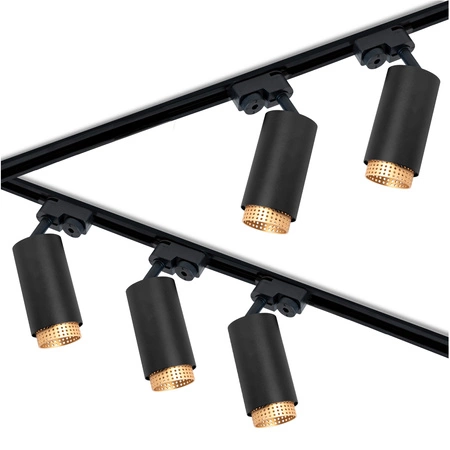Kompletná súprava dvoch koľajníc, 5 reflektorov a montážnych konzol a jednoduchá montáž umožňuje rýchle upevnenie celej súpravy bez použitia špecializovaného náradia. Reflektory s päticami GU10 pracujú s diódami LED s výkonom do 12 W, čo vám dáva možnosť slobodne si vybrať farbu a svetelný výkon pri nízkej spotrebe energie. Moderné čierno-zlaté vyhotovenie a štíhly valcovitý tvar v matnej čiernej farbe podčiarkujú štýl industriálnych a minimalistických interiérov.