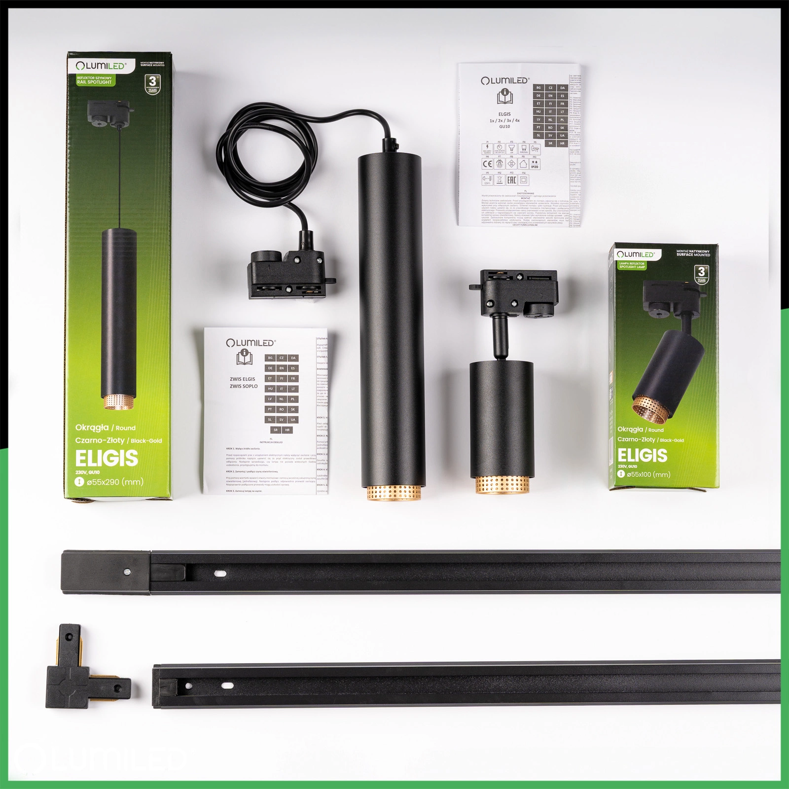 Kompletná súprava obsahuje dve koľajnice, 3 reflektory, 3 závesné svietidlá a montážne konzoly a jednoduchá montáž umožňuje rýchle upevnenie bez použitia špecializovaného náradia. Bodové svetlá s päticami GU10 pracujú s LED diódami s výkonom do 12 W, čo vám dáva možnosť slobodne si vybrať farbu a svetelný výkon pri nízkej spotrebe energie. Moderné čierno-zlaté vyhotovenie a štíhly valcovitý tvar v matnej čiernej farbe podčiarkujú štýl industriálnych a minimalistických interiérov.