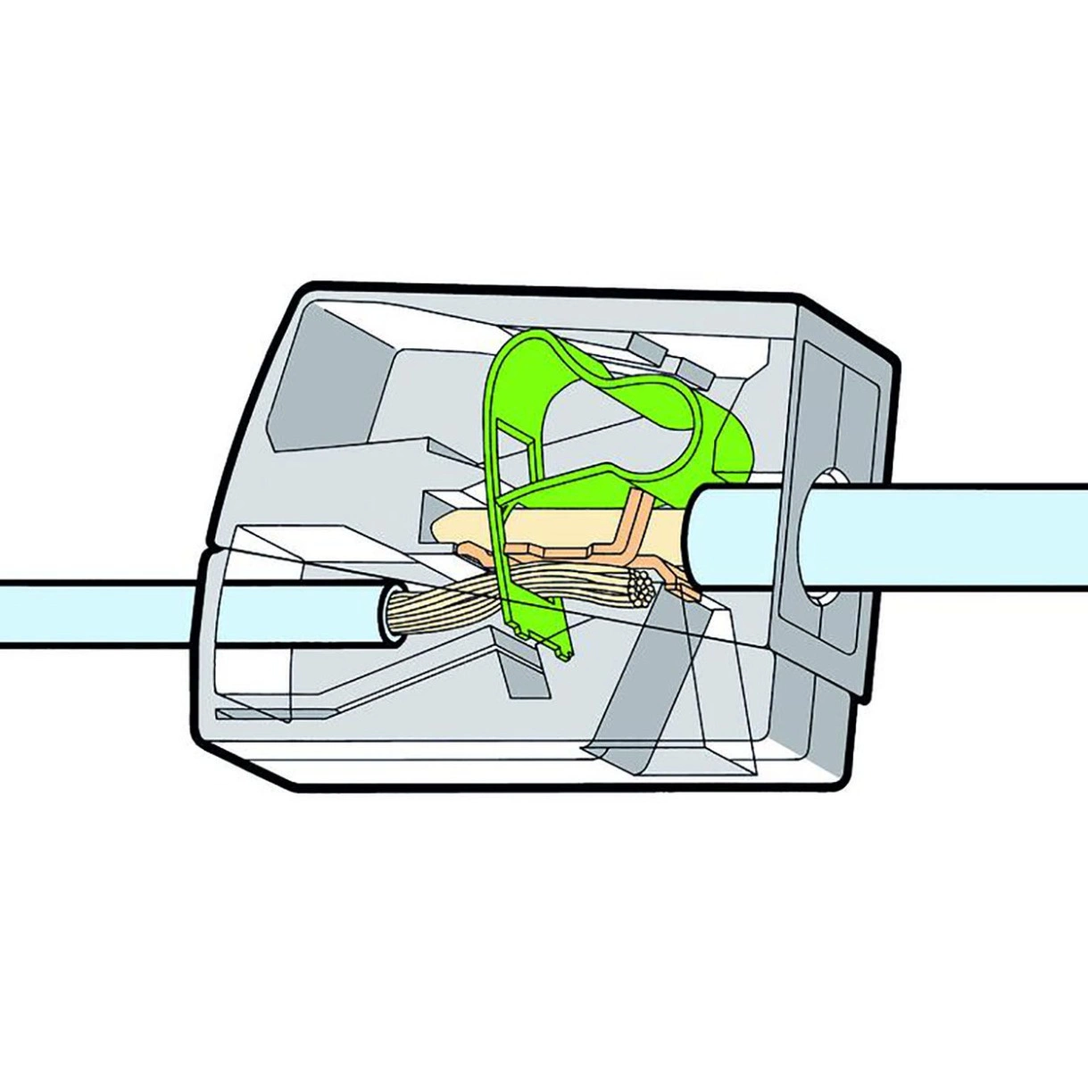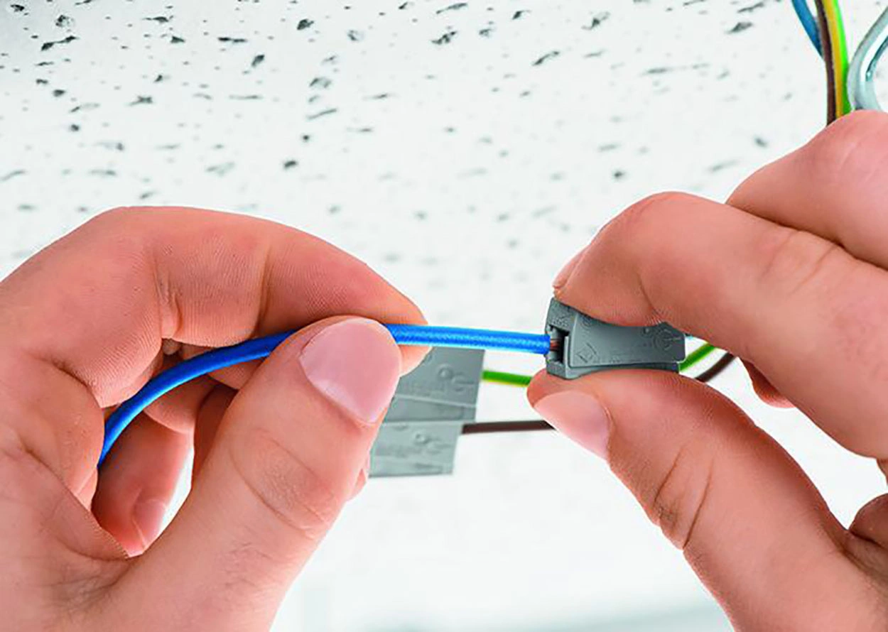 - Montaż wtykowy 2 przewodów jednodrutowych (od strony instalacji) oraz przewodu linkowego, wielodrutowego lub jednodrutowego (od strony oprawy oświetleniowej)