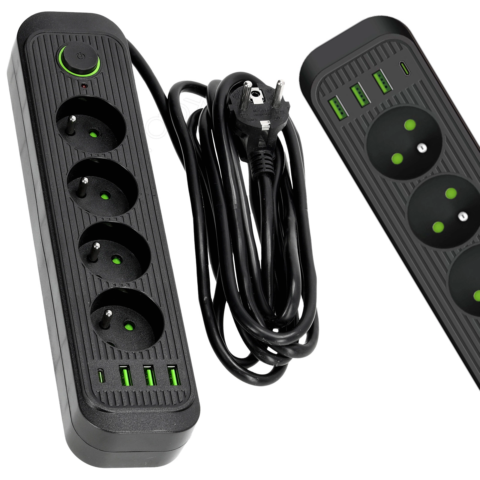 • Štyri napájacie zásuvky: Umožňujú jednoduché zapojenie viacerých zariadení naraz, čo je ideálne pre domácnosť alebo kanceláriu.
