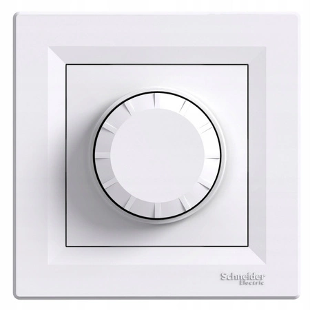 Ściemniacz przyciskowo-obotowy z funkcją łącznika schodowego w kolorze białym, serii Asfora, marki Schneider Electric. Charakteryzuje się wysoką jakością wykonania, współpracuje z tradycyjnymi żarówkami oraz halogenami 230V oraz niskonapięciowymi halogenami zasilanymi za pośrednictwem transformatora elektronicznego w zakresie mocy 20-315W. Ściemniacz posiada wbudowany potencjometr pozwalający na ustawienie minimalnego poziomu natężenia oświetlenia, oraz wyposażony jest w bezpiecznik.