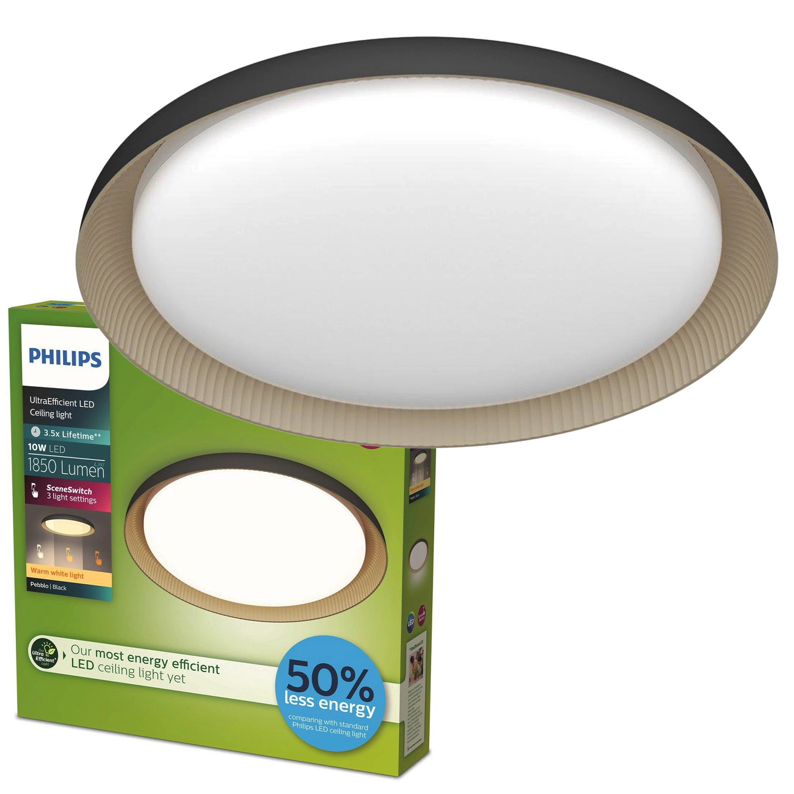 Objavte moderné a mimoriadne účinné stropné svietidlo Pebblo LED od spoločnosti Philips, ktoré dodá eleganciu každej miestnosti. Tento čierny plafón s výkonom 10 W a svetelným tokom 1850 lm poskytuje ideálne osvetlenie a spĺňa požiadavky moderného štýlu. Vďaka technológii SceneSwitch môžete jednoducho nastaviť teplotu farieb podľa svojich potrieb a farba svetla 2700 K poskytuje teplé a útulné osvetlenie.