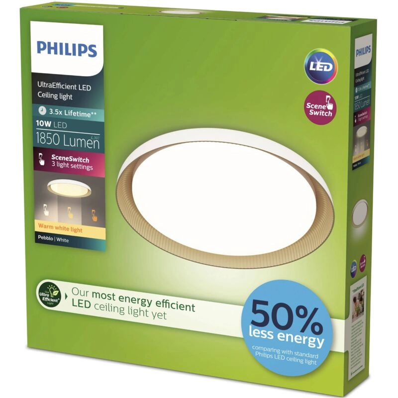 Predstavujeme vám moderné stropné svietidlo Pebblo Ultra Efficient Philips LED, ktoré spája štýlový dizajn s energetickou účinnosťou. Toto stropné svietidlo s výkonom 10 W a pôsobivým výkonom 1850 lúmenov poskytuje dokonalé osvetlenie v každej miestnosti. Využíva technológiu SceneSwitch, ktorá umožňuje nastaviť farbu svetla 2700 K a vytvoriť tak tú správnu atmosféru, od relaxačnej až po zameranú na úlohy. Vďaka životnosti až 50 000 hodín je investíciou na mnoho rokov a dokonale zapadne do každého moderného interiéru. Lampa je vyrobená s dôrazom na detail a zaručuje jednoduchú inštaláciu, takže je ideálnou voľbou pre tých, ktorí si cenia pohodlie a spoľahlivosť. Je napájaná bezpečným napätím 220-240 V a bola navrhnutá s ohľadom na životné prostredie, čím sa znižuje spotreba energie. Jeho všestrannosť dopĺňa štýlový biely dizajn, ktorý dokonale zapadne do rôznych interiérov. Keď si vyberiete túto lampu, získavate spoľahlivý zdroj svetla od osvedčenej značky, akou je Philips.