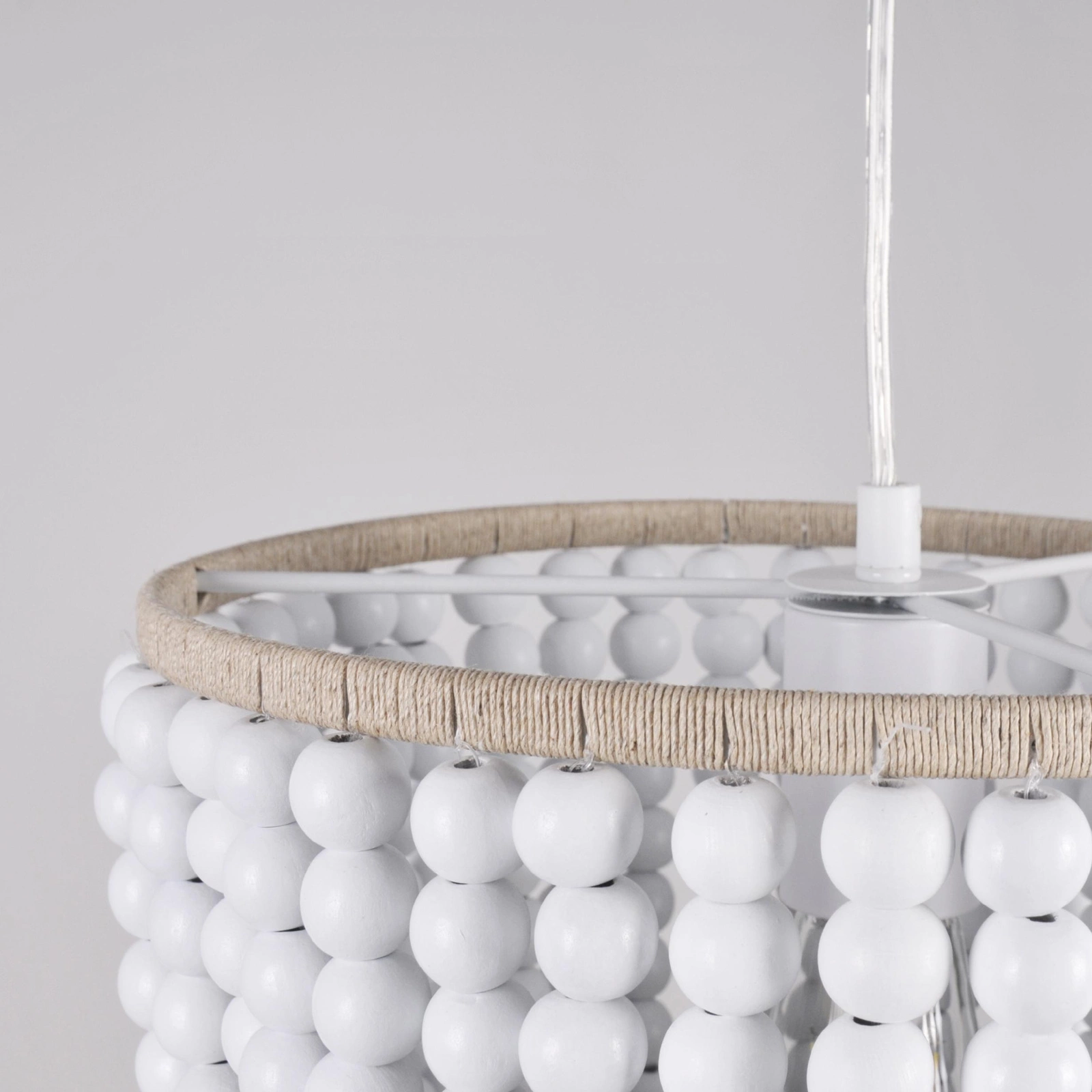 - Vysokokvalitné materiály: Lampa je vyrobená z bielych drevených korálikov a béžovej šnúry a vyznačuje sa pevným spracovaním a odolnosťou.