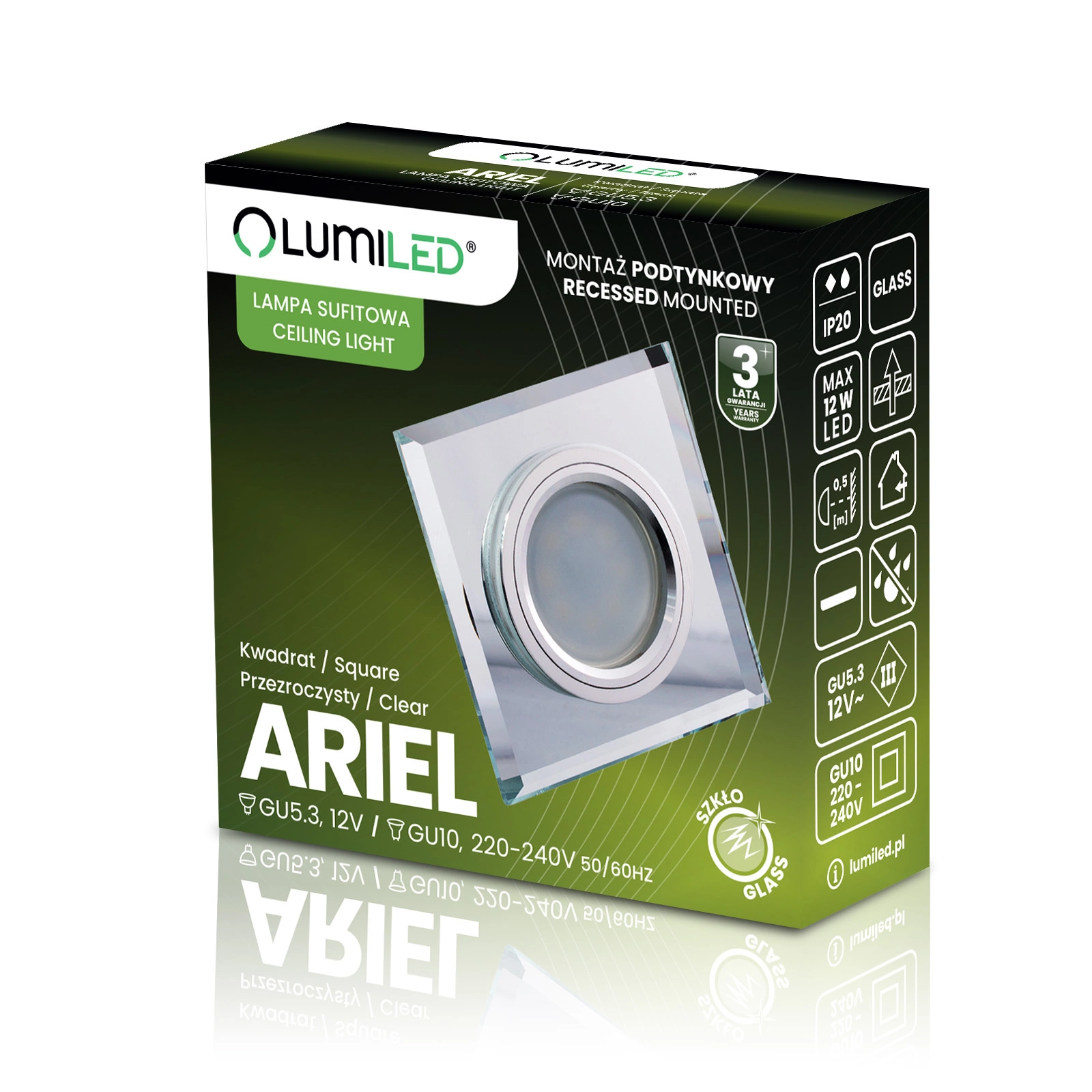 Kwadratowa oprawa sufitowa serii ARIEL marki LUMILED to innowacyjny produkt pasujący do wnętrz w stylu nowoczesnym i minimalistycznym. Dzięki swojemu designowi, a konkretnie tafli lustra przykrytej przeźroczystym szkłem czyni pomieszczenie optycznie większym, bardziej otwartym i jaśniejszym. Ścięte krawędzie oprawy sprawiają, że oprawa idealnie komponuje się z sufitem.