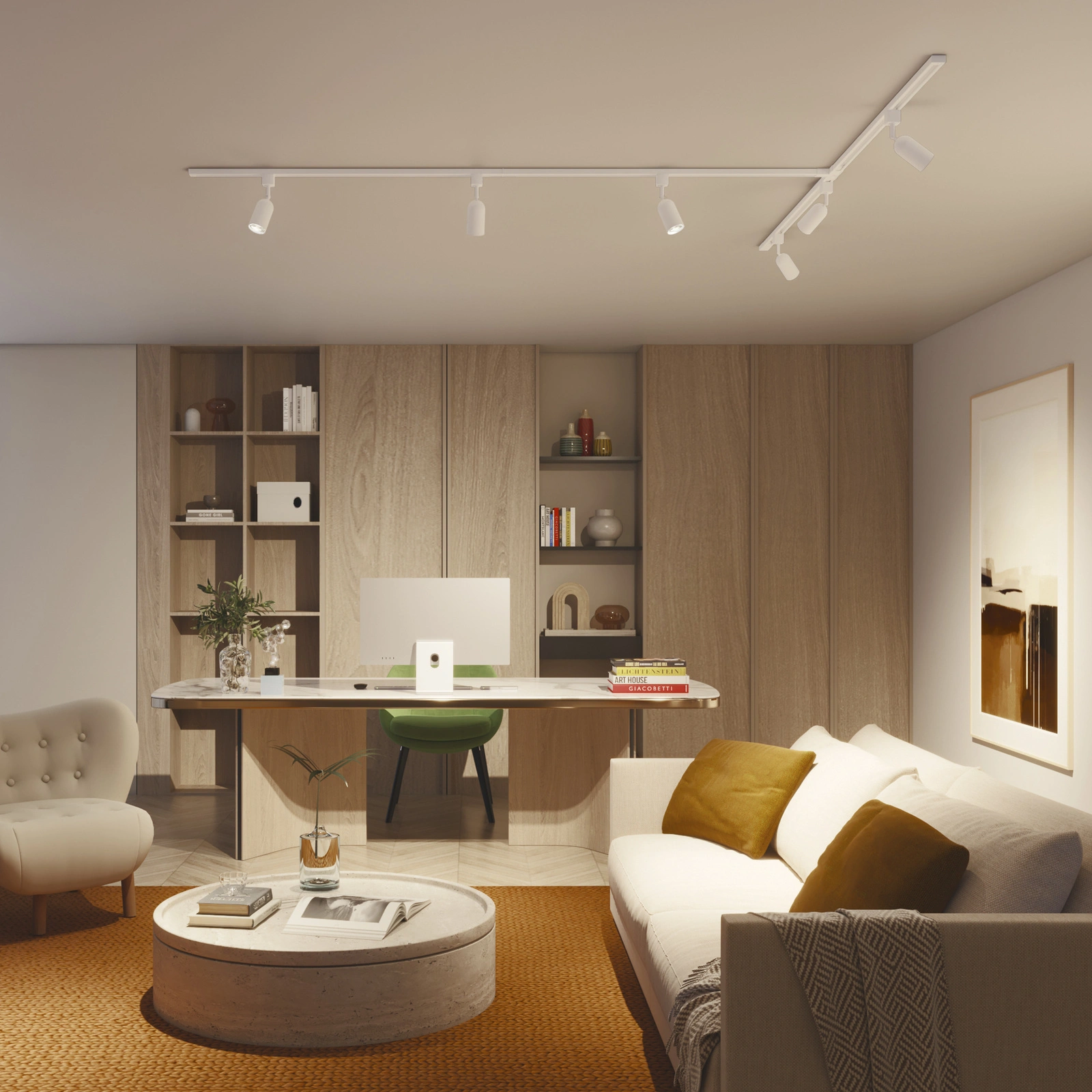 Systém koľajničiek vám poskytuje úplnú kontrolu nad osvetlením a umožňuje vám prispôsobiť ho presne životnému štýlu vášho domova. Funguje so širokou škálou štandardných a inteligentných žiaroviek a bodových svietidiel s päticou GU10, čo vám dáva slobodu výberu presne takého svetla, aké potrebujete. Možnosť použitia stmievateľných svetelných zdrojov s diaľkovým ovládaním vám umožní jednoducho budovať atmosféru vášho interiéru, zatiaľ čo žiarovky s reguláciou teploty farieb vám umožnia plynulo prechádzať od studeného, stimulujúceho bieleho svetla k teplému, relaxačnému svetlu. Ide o riešenie, ktoré vám umožní jediným pohybom zmeniť charakter miestnosti a prispôsobiť osvetlenie každému okamihu dňa.