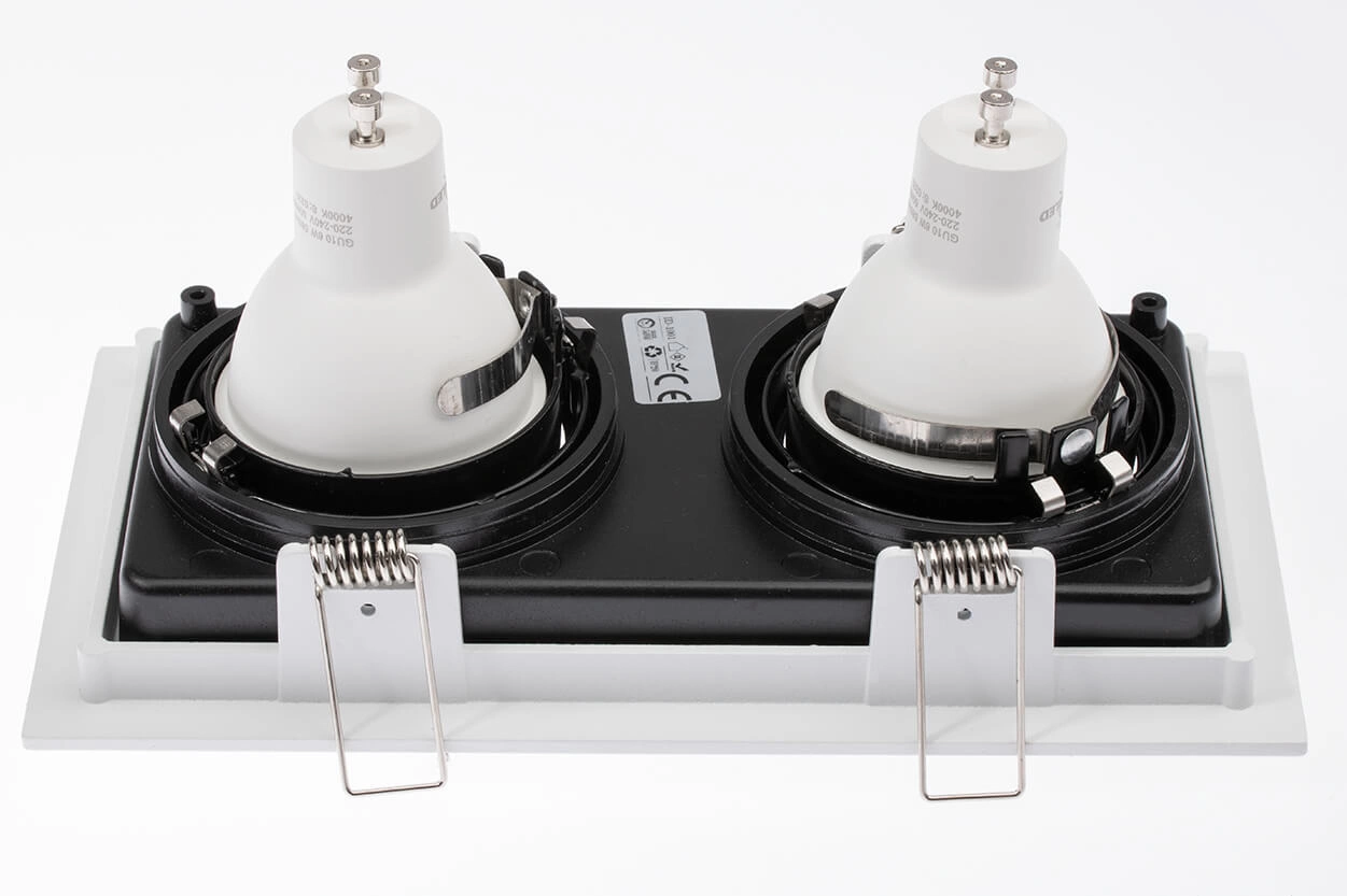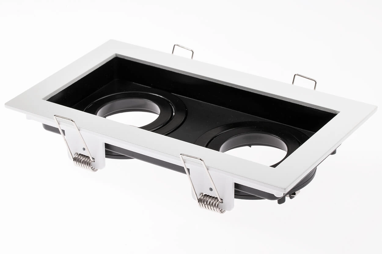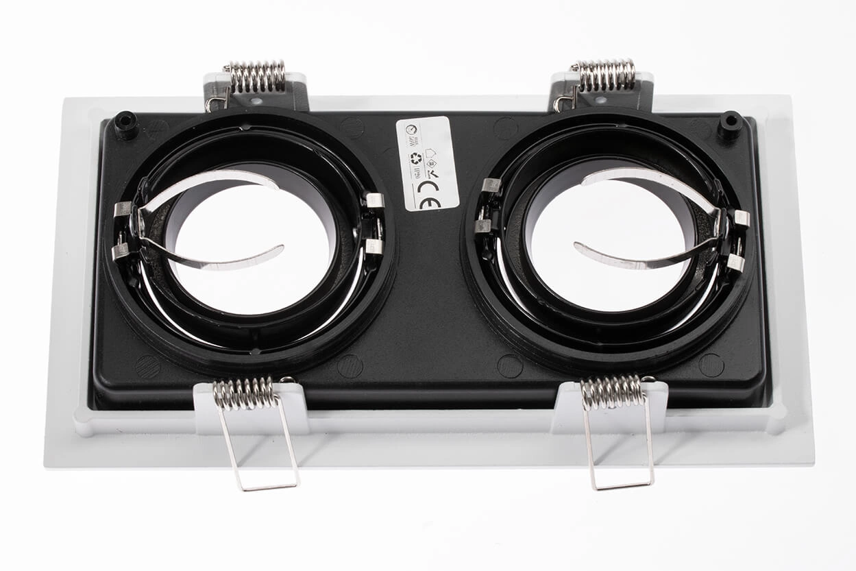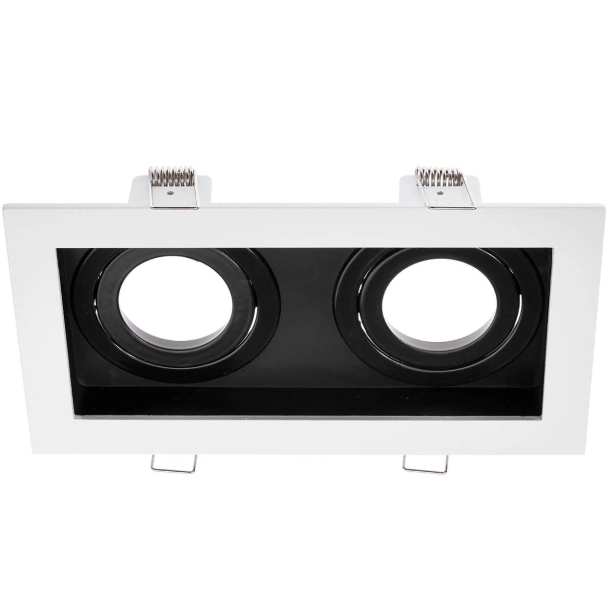 Ruchoma Kwadratowa Oprawa Halogenowa w kolorze BIAŁO - CZARNYM, została wykonana z wysokiej jakości aluminium. Wyposażona zostałą w dwa miejsca na żarówki GU10. Przystosowana została do montażu podtynkowego, a w połączeniu z wysokiej jakości żarówkami LED może służyć do podświetlenia dekoracyjnego, jak i do oświetlenia ogólnego w większych otwartych pomieszczeniach, gdzie zastosowanie pojedynczego źródła światła okazuje się niewystarczające, a dzięki swojemu nowoczesnemu wyglądowi swoje zastosowanie znajdzie w każdych nowocześnie urządzonych mieszkaniach, domach czy też eleganckich biurach.
