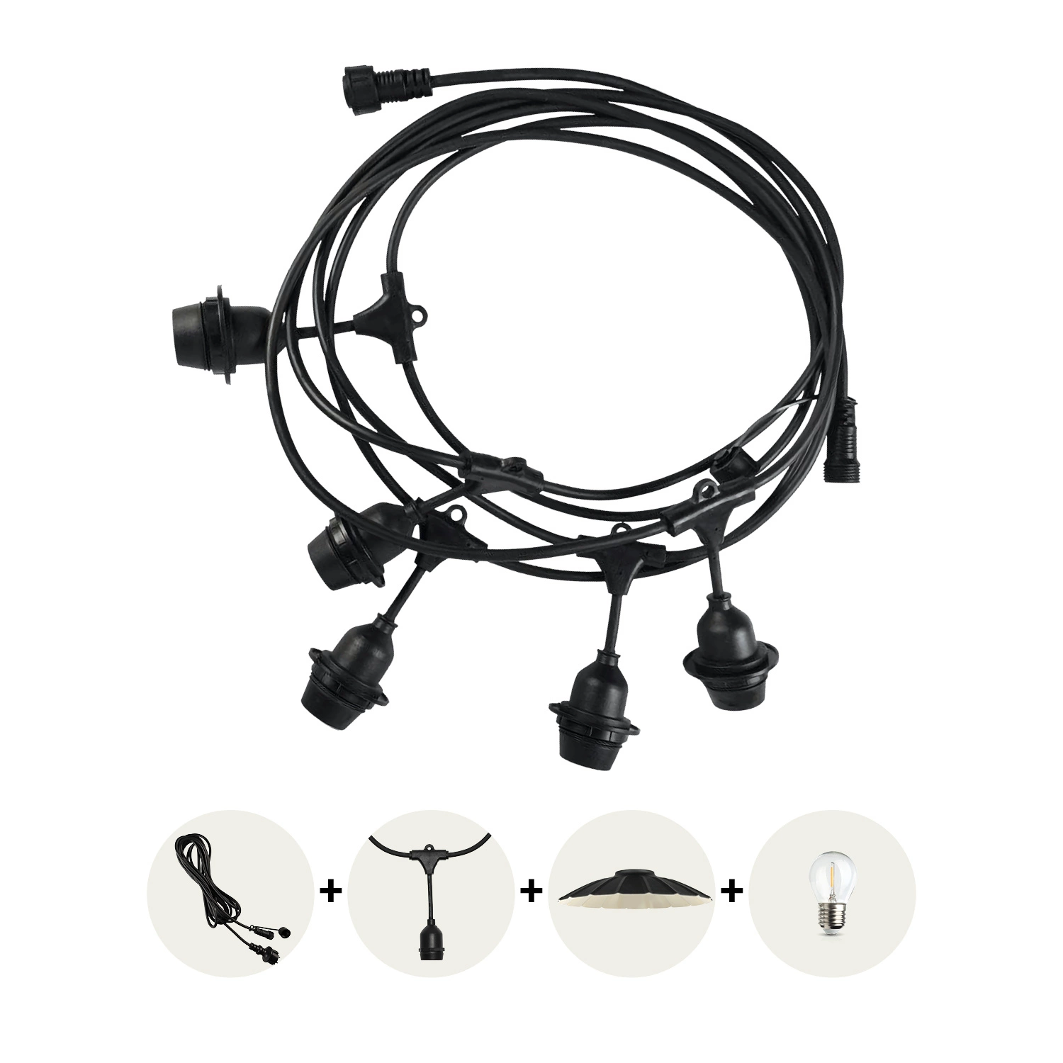 - Štýlové vonkajšie osvetlenie: Elegantná svetelná reťaz, ktorá vylepší atmosféru každej záhrady, terasy alebo terasy.