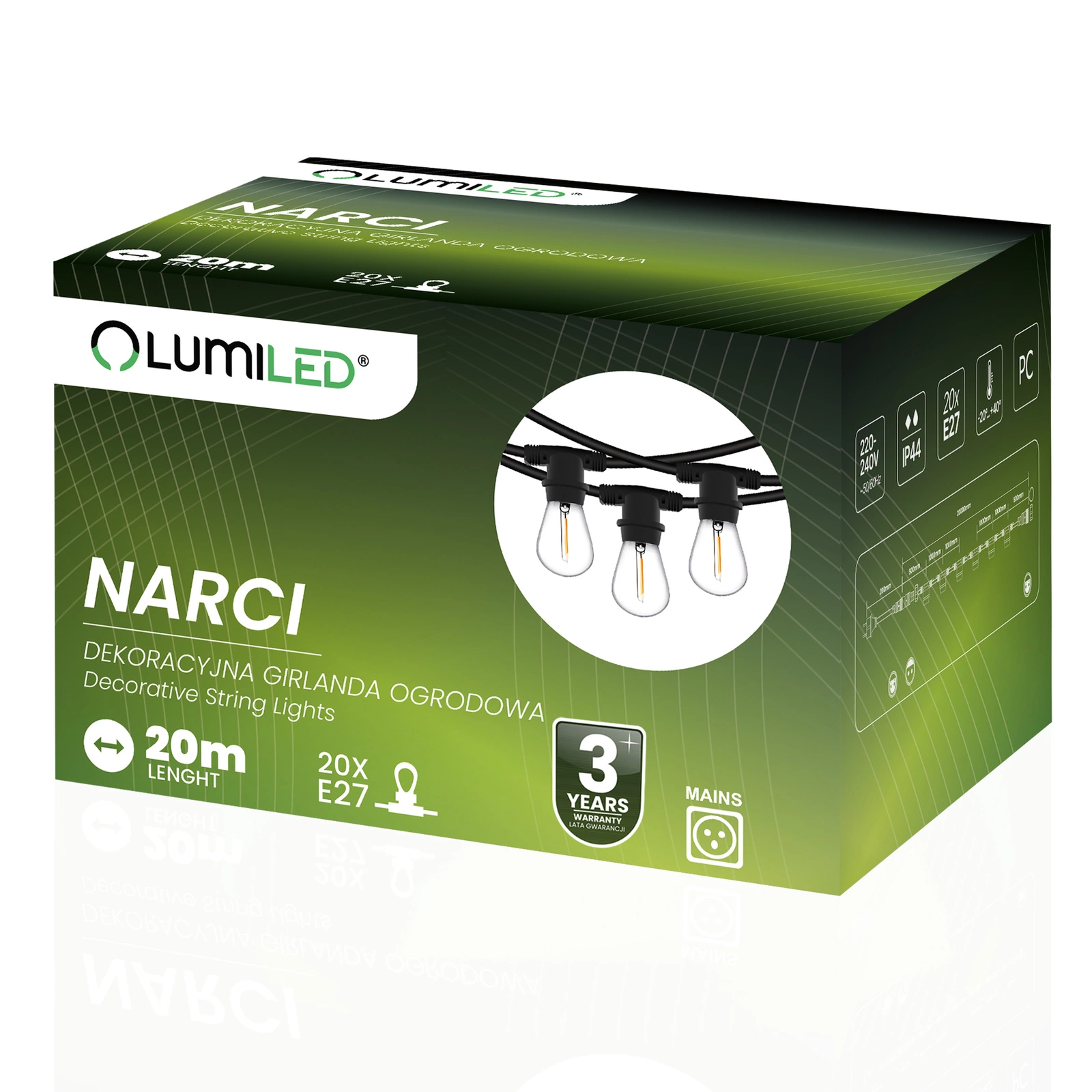 LUMILED NARCI je 20 metrov dlhý záhradný dekoratívny veniec s 20 päticami E27 a sadou 20 2W 3000K LED žiaroviek. Hotová súprava vám umožní okamžite vytvoriť útulnú atmosféru v záhrade, na terase alebo počas vonkajších stretnutí. Rovnomerné rozloženie svetelných bodov zabezpečuje harmonické osvetlenie a celá súprava spája funkčnosť s jedinečným štýlom. Je to nielen praktické a kompletné riešenie, ale aj štýlová dekorácia, ktorá premení každý priestor.