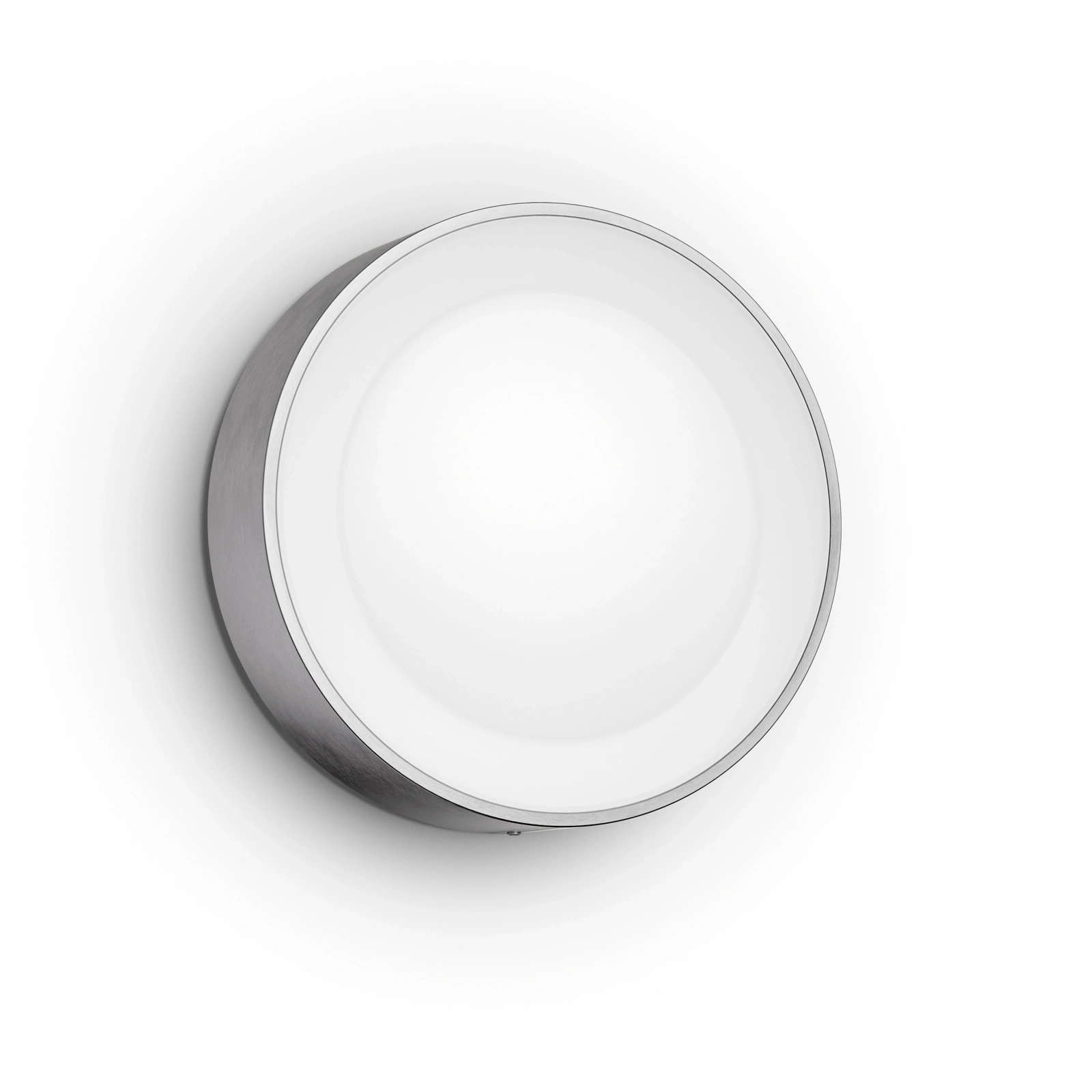 Przedstawiony okrągły kinkiet Daylo w kolorze srebrnym rozsyła krąg światła od fasady budynku, świecąc kolorowym światłem w jednym z 16 milionów kolorów. Ta lampa zewnętrzna pozwala uzyskać miękkie, kierowane na zewnątrz efekty świetlne, jak również delikatne podświetlenie za oprawą.