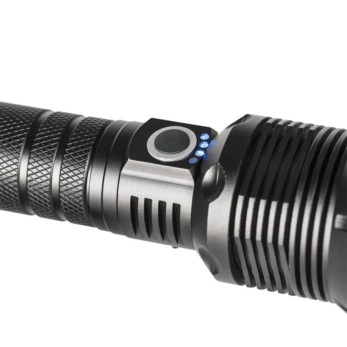 Diody wbudowane w rękojeści wskazują stopień naładowania latarki - im mniej się ich świeci, tym latarka bardziej rozładowana.