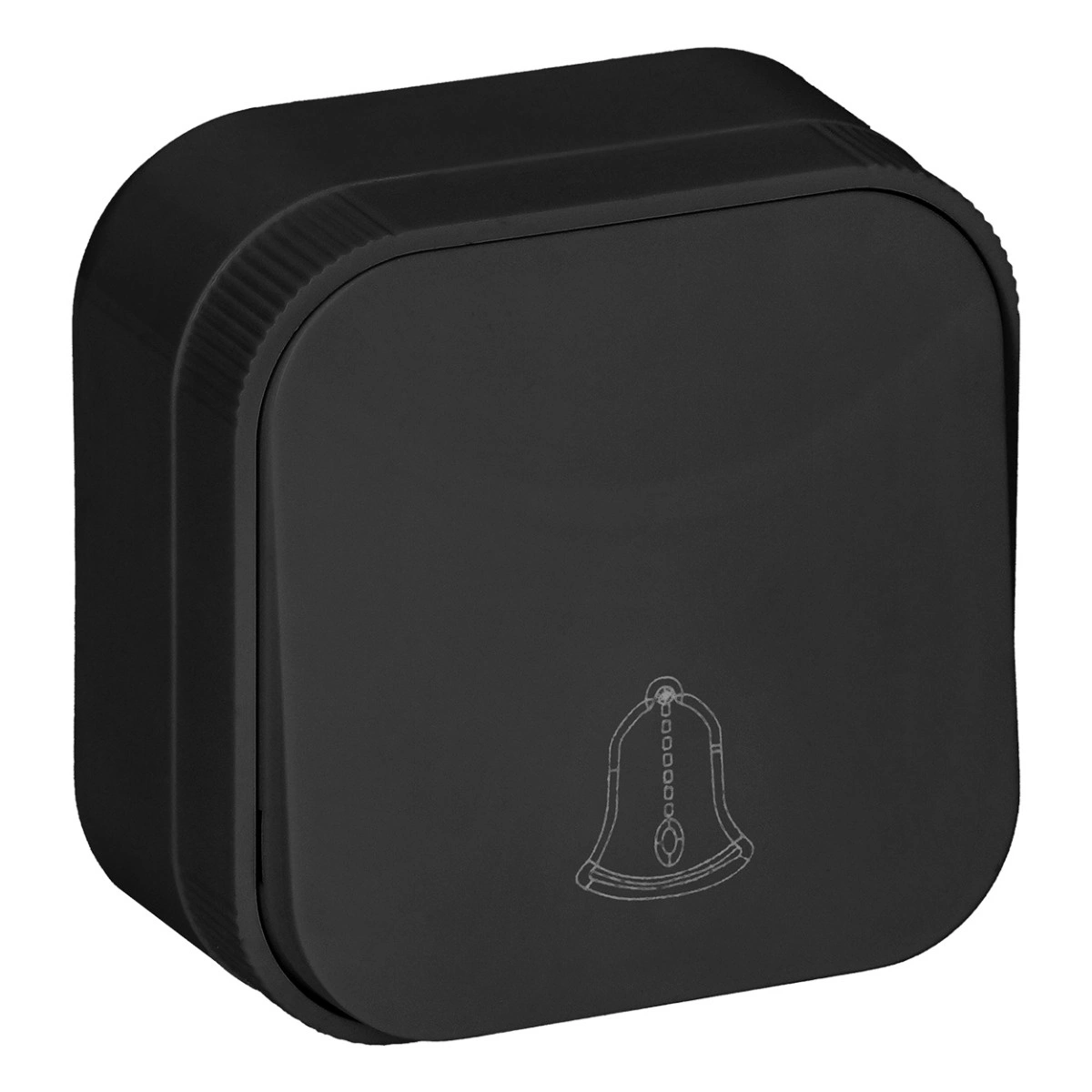 Przycisk Dzwonkowy z zaokrąglonymi krawędziami w kolorze czarnym, do montażu natynkowego. Prezentowany Włącznik służy do połączenia z dzwonkiem.